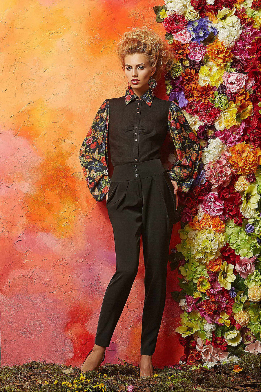 Элегантная блуза выполнено на сочетании двух тканей: основная ткань- лён, а рукава и воротник выполнены из итальянской шёлковой ткани. Ткани разные не только по своей фактуре, но и по цвету. Воротник стойка, застежка на пуговицах по переду. (Брюки артикул M2131В3001).