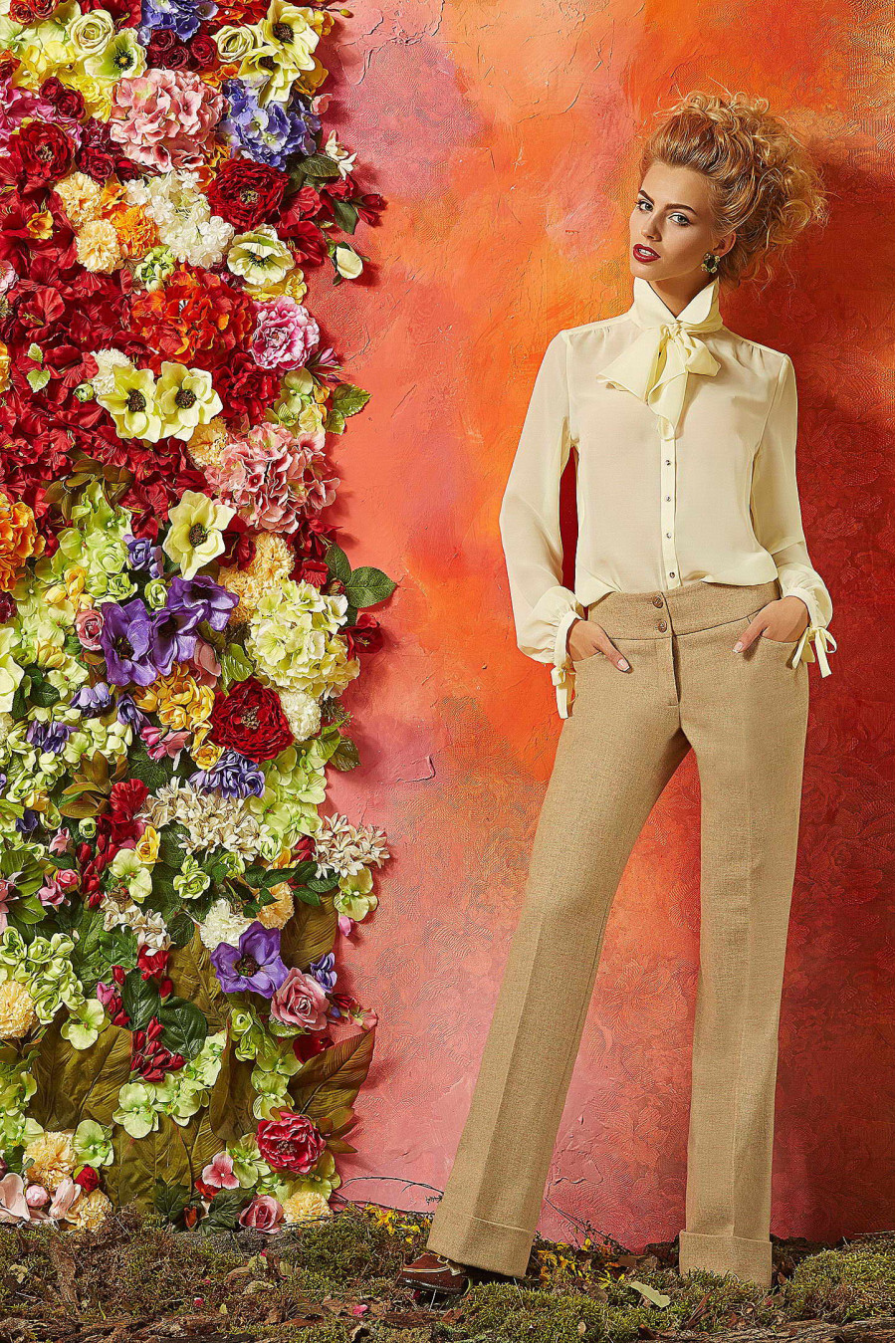 Блузка выполнена из шифона, воротник оформлен изящным шифоновым бантом, по переду располагается планка на пуговицах. Длинный втачной рукав на небольшом манжете также оформлен шифоновым бантиком. (Брюки артикул: M2141В3001, Жакет артикул M2141G2001).