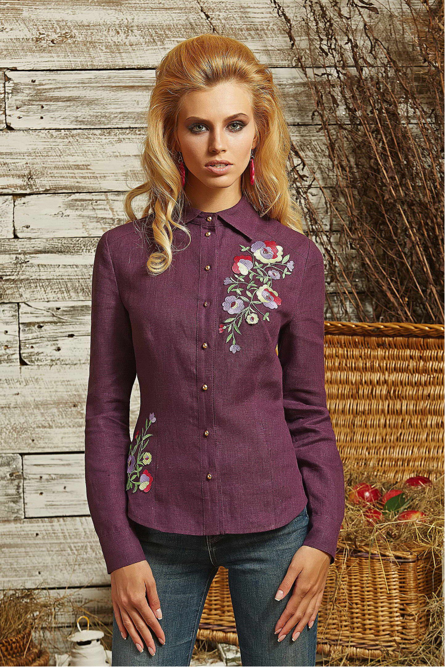 Стильная женская блузка, выполнена из натурального льна, украшена цветочной вышивкой. Воротник на стойке, застежка на пуговицы по переду изделия. Вертикальные рельефы на полочке и спинке визуально удлиняют пропорции. Манжеты на рукавах застегиваются на пуговицы. Низ рубашечный, скругленный.