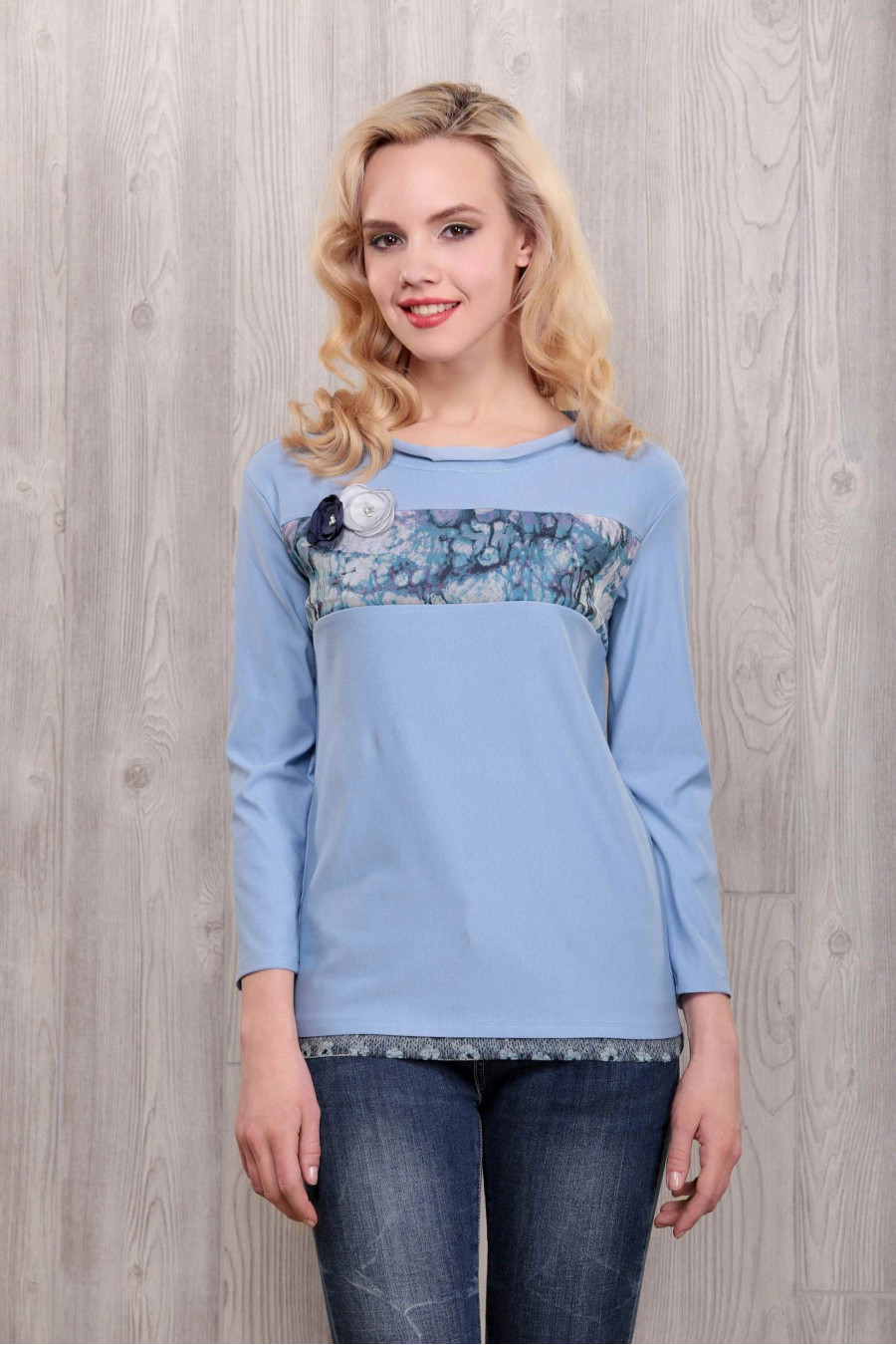 Нежный свитшот с горизонтальной вставкой в районе груди и оригинальной отделкой горловины. Брошь в комплект не входит.