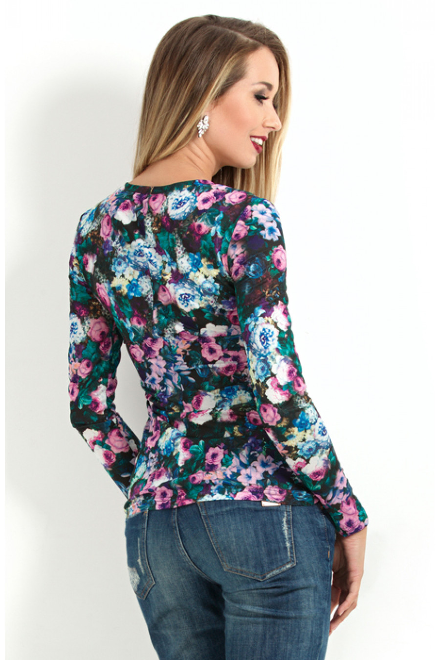 Трикотажная блузка прилегающего силуэта. Вырез горловины средней глубины, обработан узкой планкой. Рукав втачной длинный. Блузка выполнена из ткани модного цветочного принта, это придает модели актуальность в этом сезоне. Многообразие цветов используемых в принте позволит блузку легко скомбинировать с Вашим гардеробом. Длина – 59-62 см (зависит от размера).