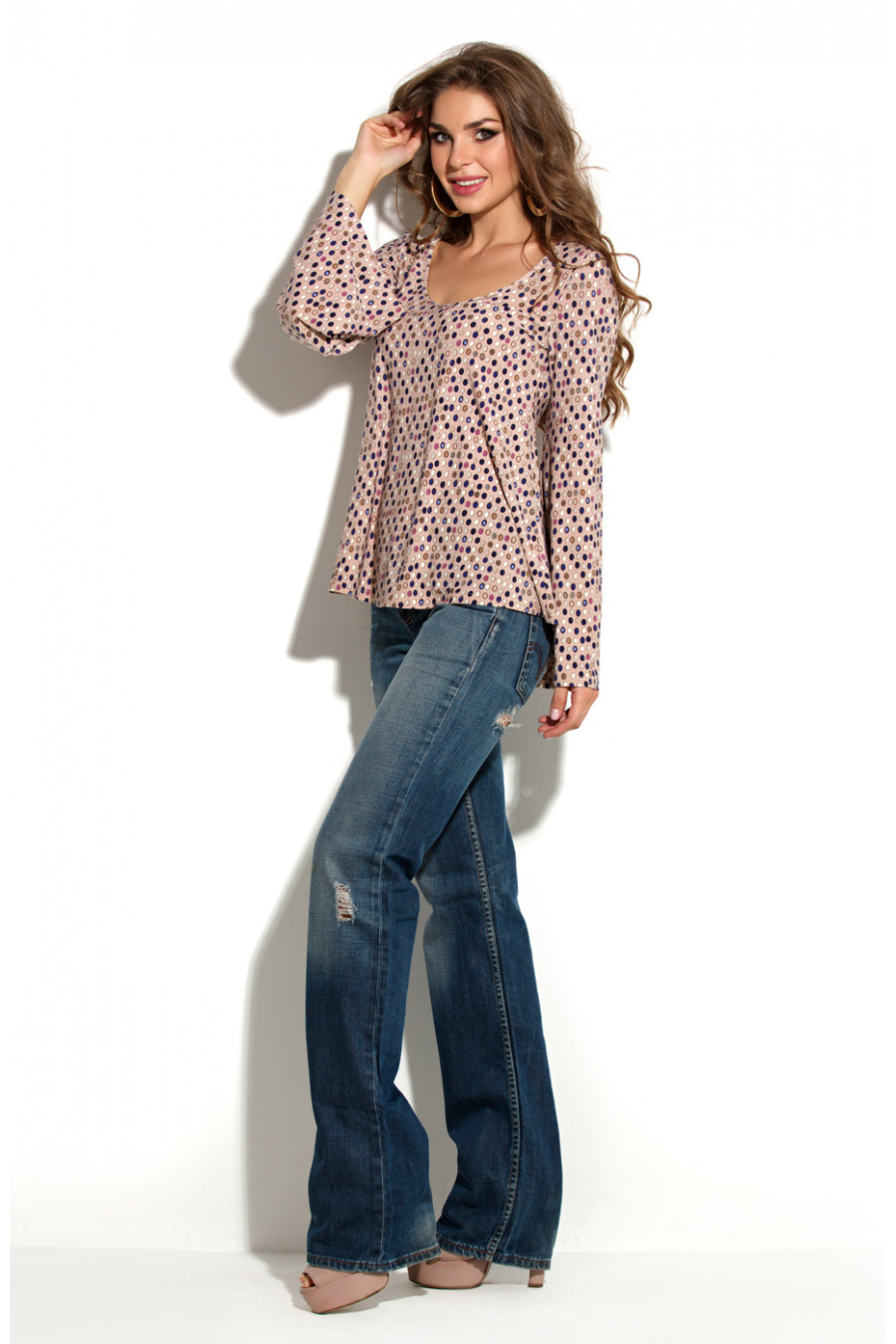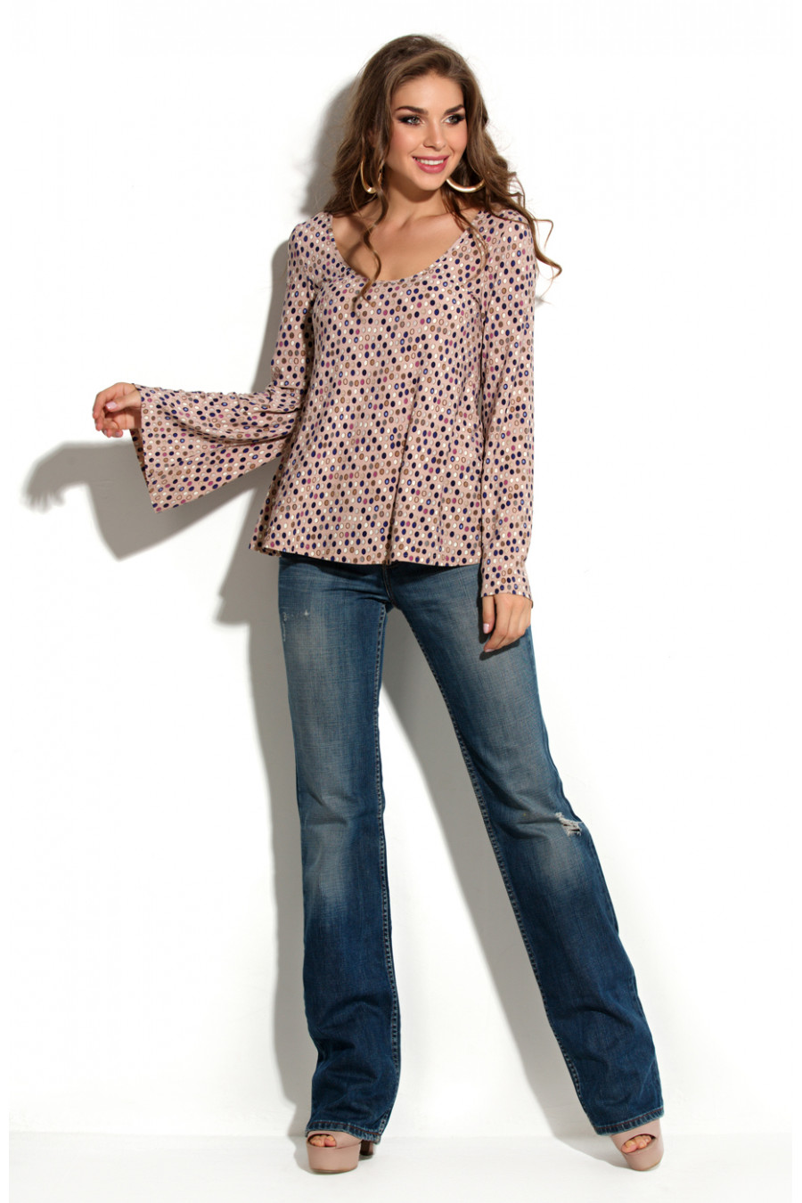 Оригинальная блузка из тонкого струящегося трикотажа. Блузка клешеная от груди, силуэт достигнут благодаря боковым швам. Рукав втачной длинный клешеный. Вырез горловины круглый глубокий. Горловина обработана кантом. Завышенная линия талии позволяет скрыть некоторые недостатки фигуры и визуально удлиняет ноги.