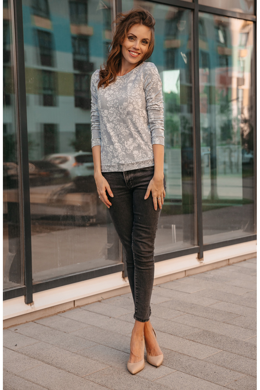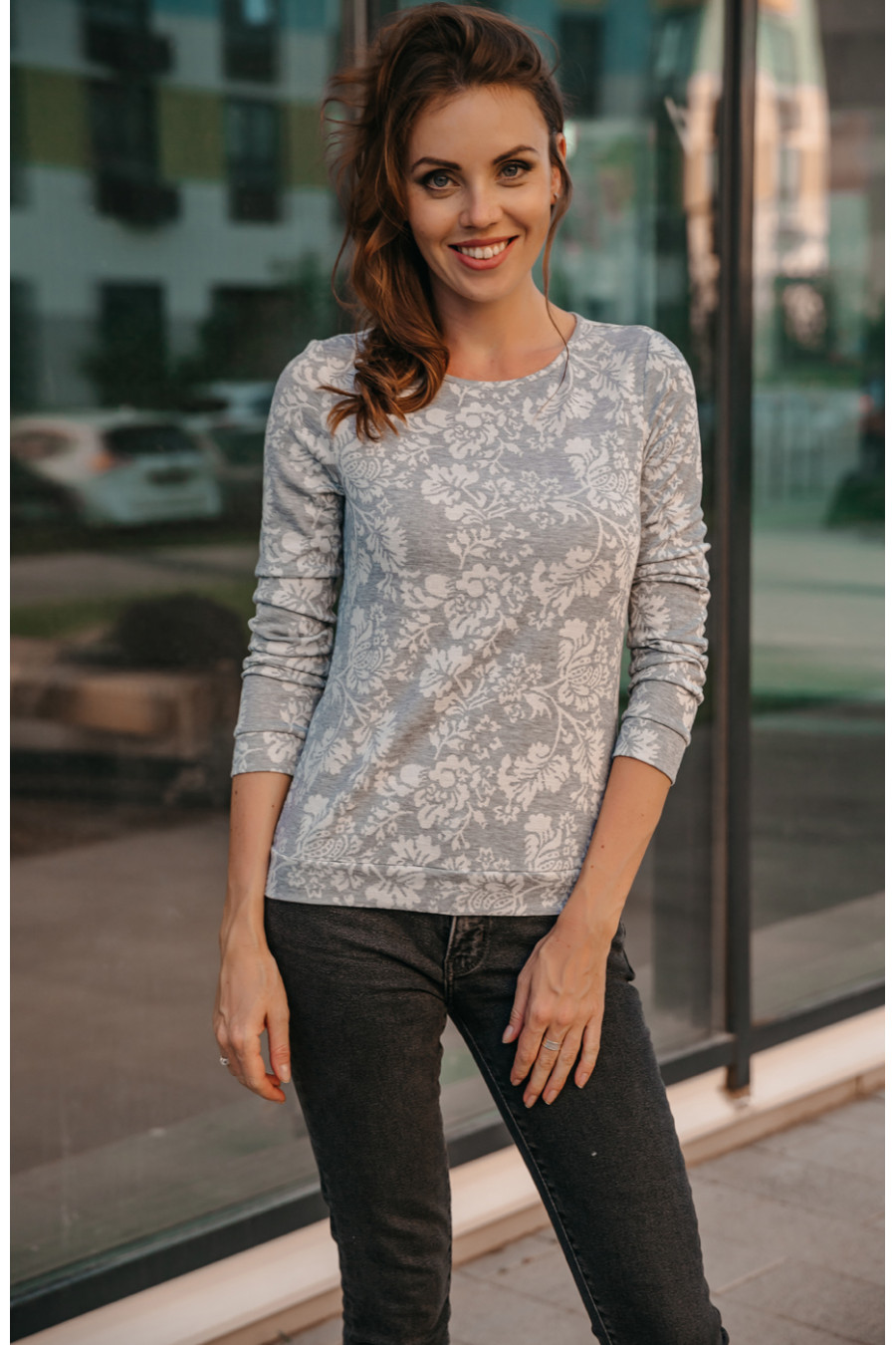 Практичный свитшот свободного покроя из трикотажной ткани с модным растительным рисуком. Низ свитшота обработан подкроенным поясом, низ рукава — манжетом. Рукав втачной длинный. Горловина круглая не глубокая, обработана кантом.