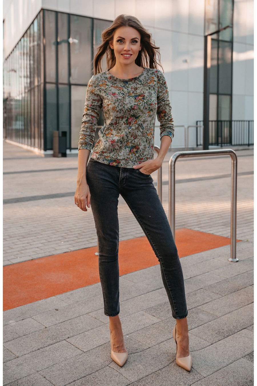Практичный свитшот свободного покроя из трикотажной ткани с модным растительным рисуком. Низ свитшота обработан подкроенным поясом, низ рукава — манжетом. Рукав втачной длинный. Горловина круглая не глубокая, обработана кантом.