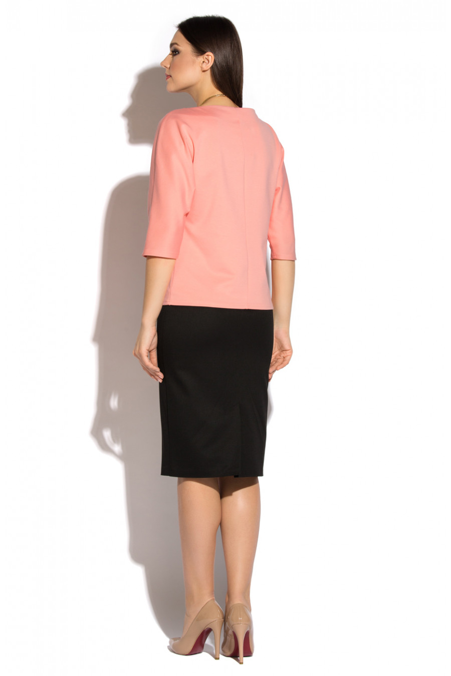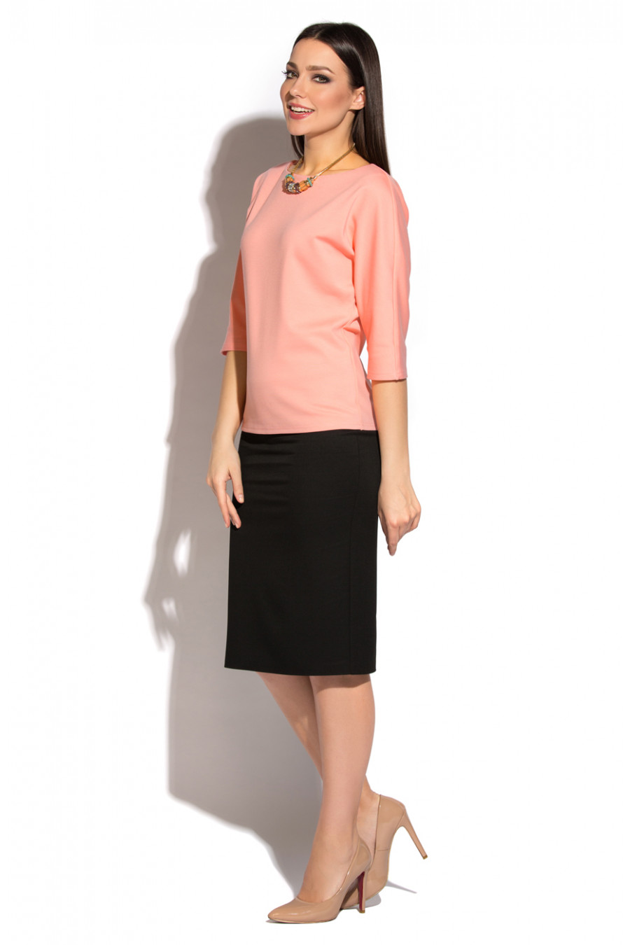 Блузка с цельнокроеным рукавом из плотного трикотажа «джерси». Вырез горловины – «лодочка». Рукав широкий до линии локтя. Спинка со средним швом. Силуэт блузки позволяет носить данную модель девушкам разного телосложения.