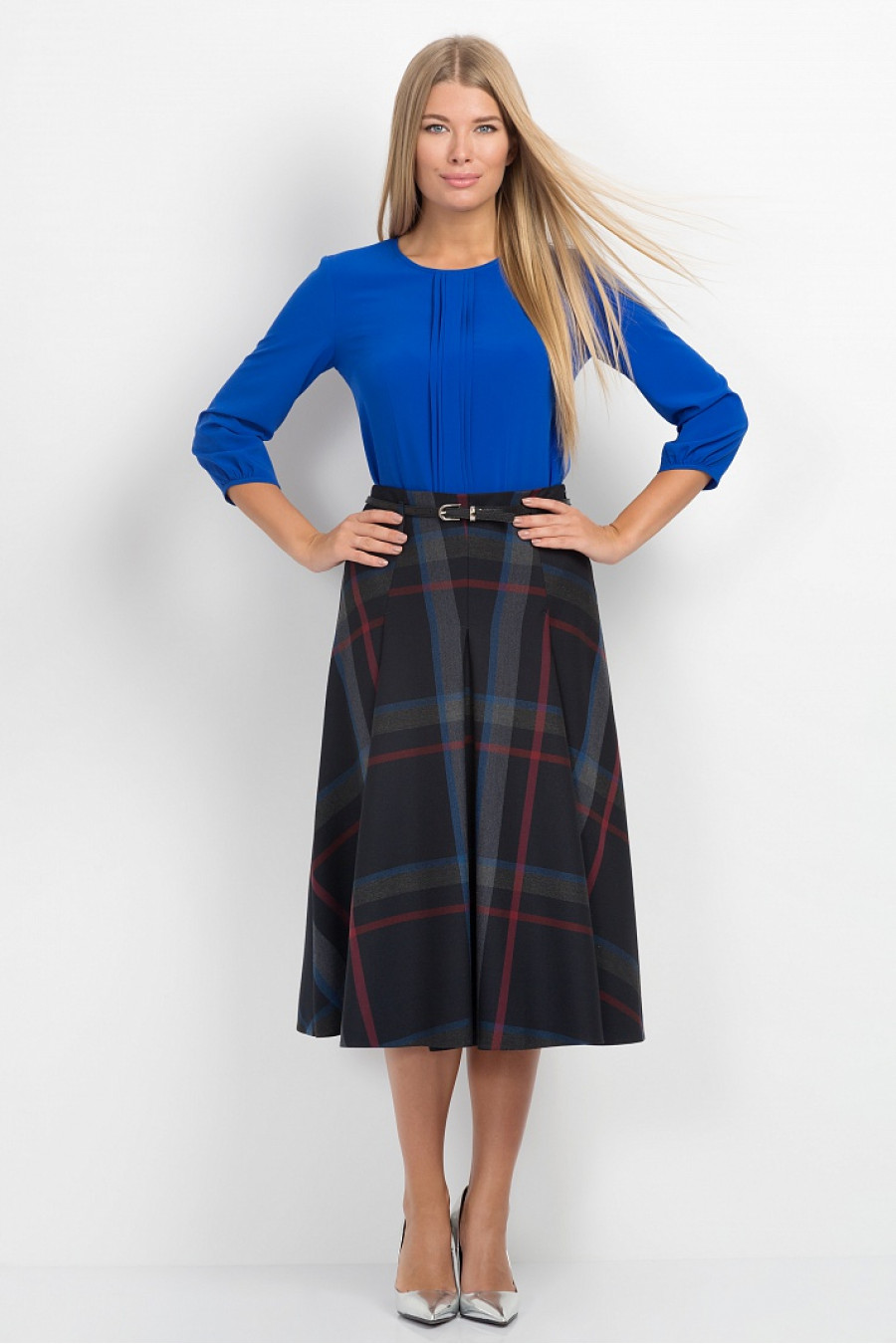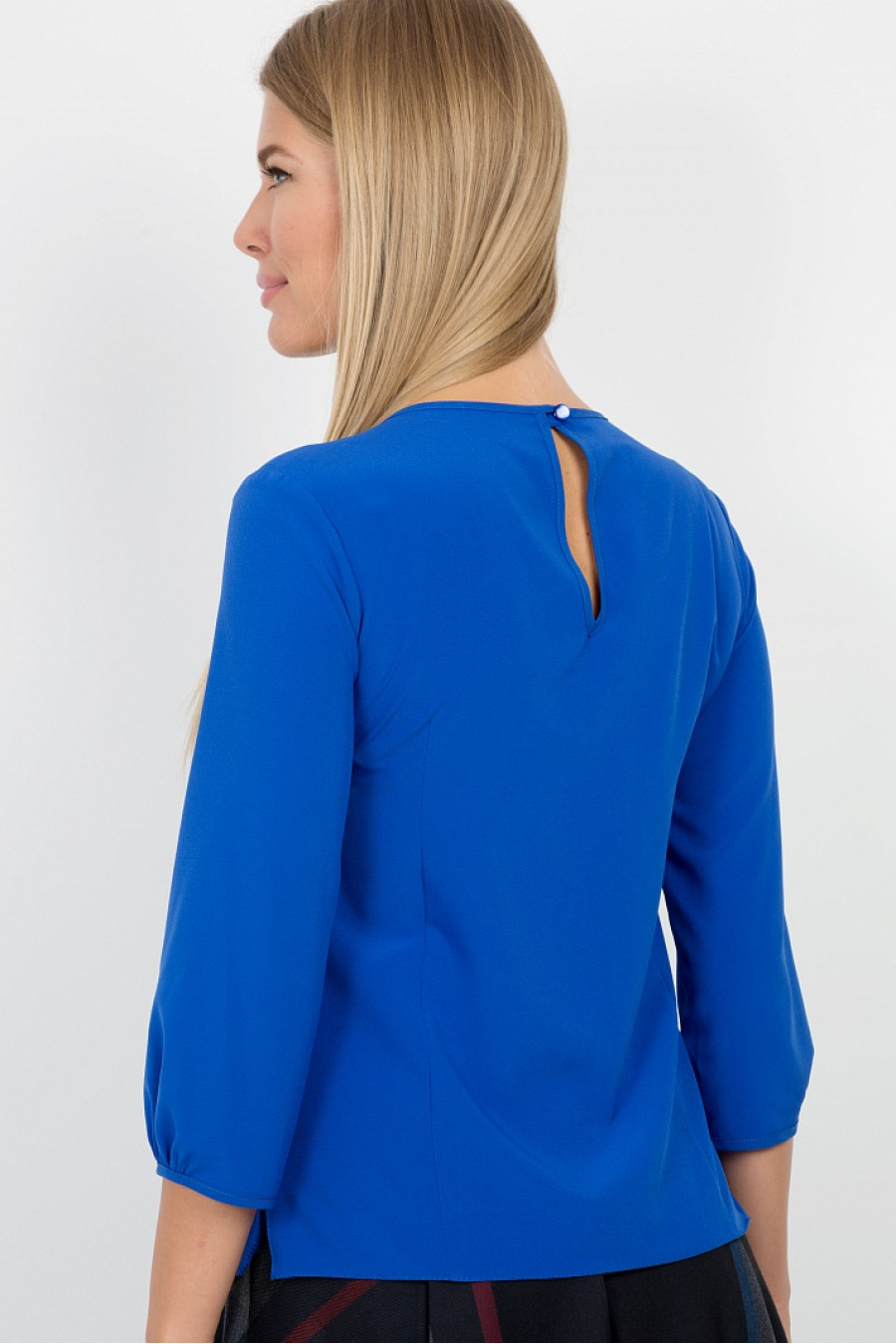 Элегантная блузка с округлым вырезом горловины, с застежкой на пуговицу на спинке и присборенными к низу рукавами 3/4. Покрой приталенный. Модель украшена планкой с рельефными складками по переду блузки. Отличный вариант на каждый день. (на фото юбка артикул:525-fedelma).""