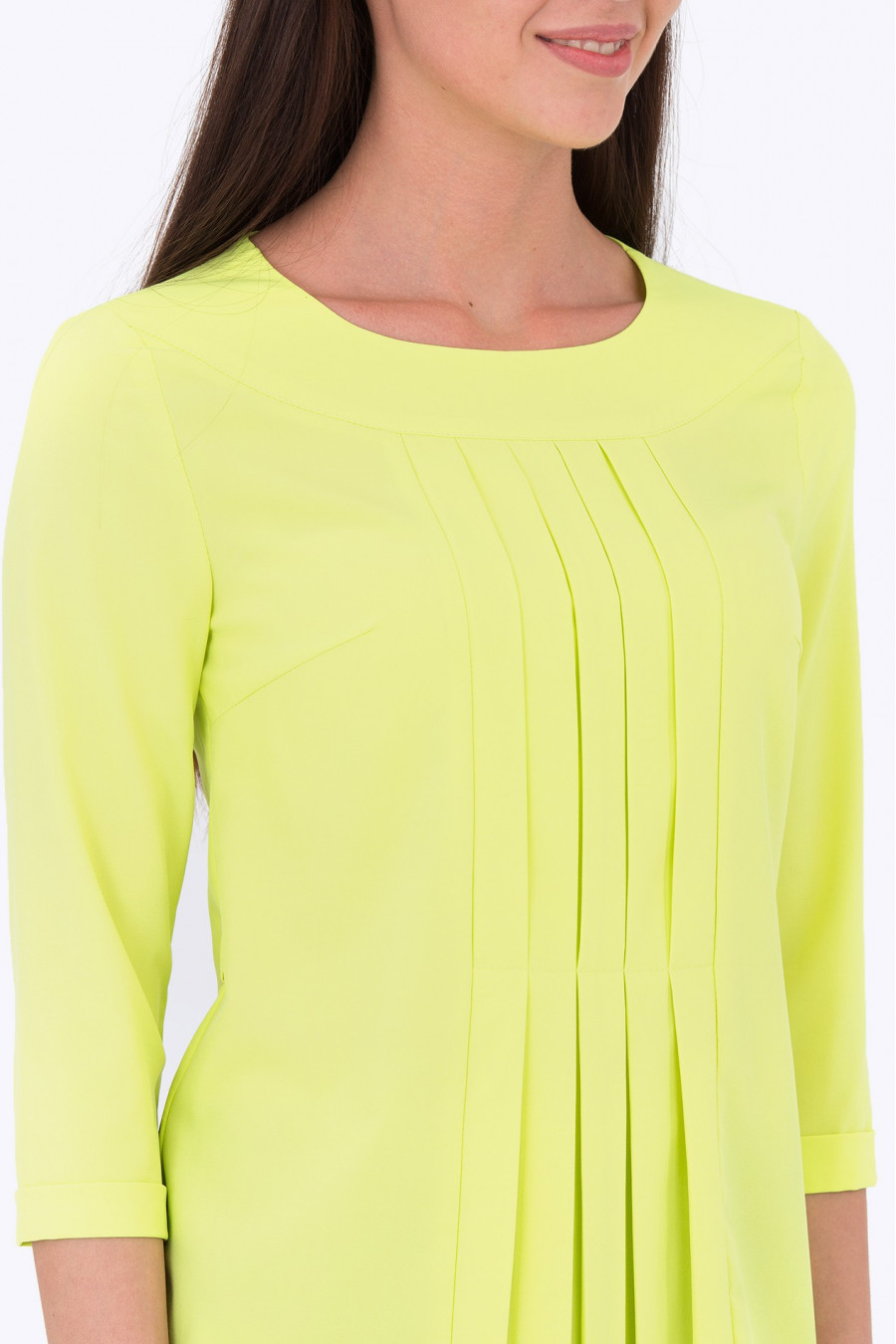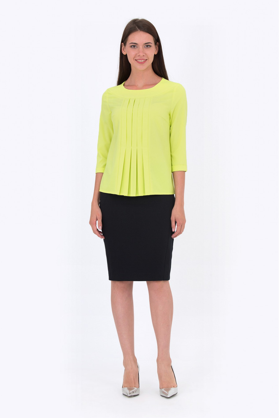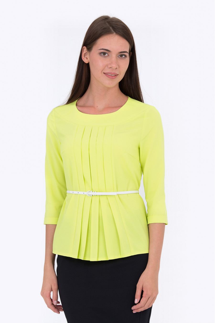 Легкая блузка ярко-желтого цвета. Ткань приятная к телу с эффектом эластичности. Рукава 3/4. Блузка спереди оформлена аккуратными складками. На поясе есть шлевки, ремешок в комплект не входит. Отличная модель на повседневную носку, хорошо сидит по фигуре, освежает цвет лица.