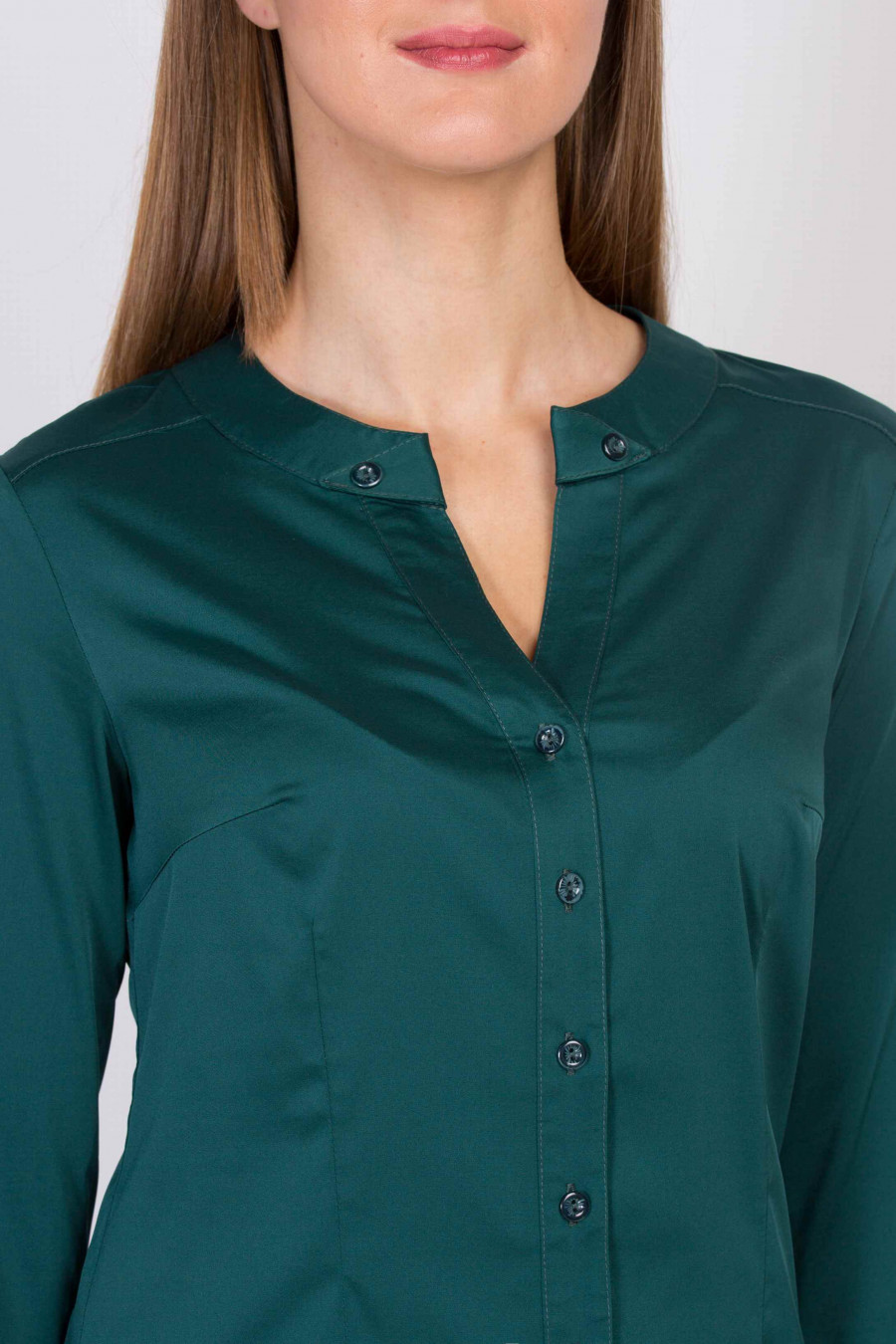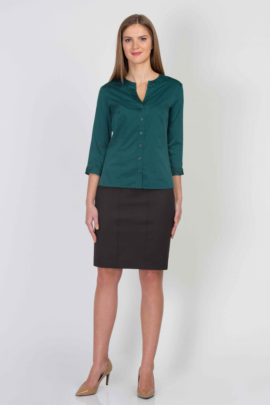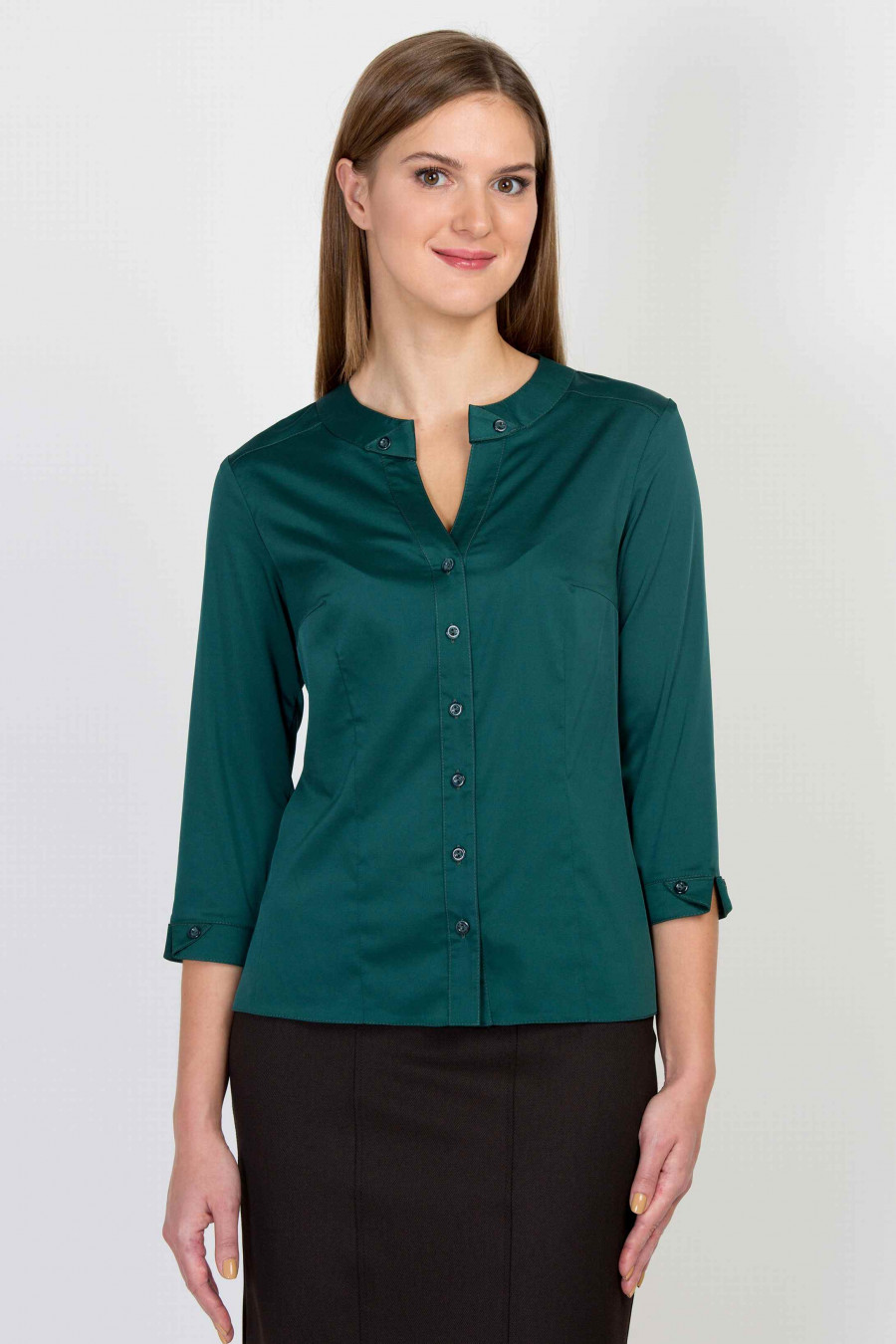 Стильная блузка с элегантным V-образным воротником и рукавами 3/4. Модель выполнена в классическом дизайне. Покрой приталенный. Модель украшена оригинальным принтом.