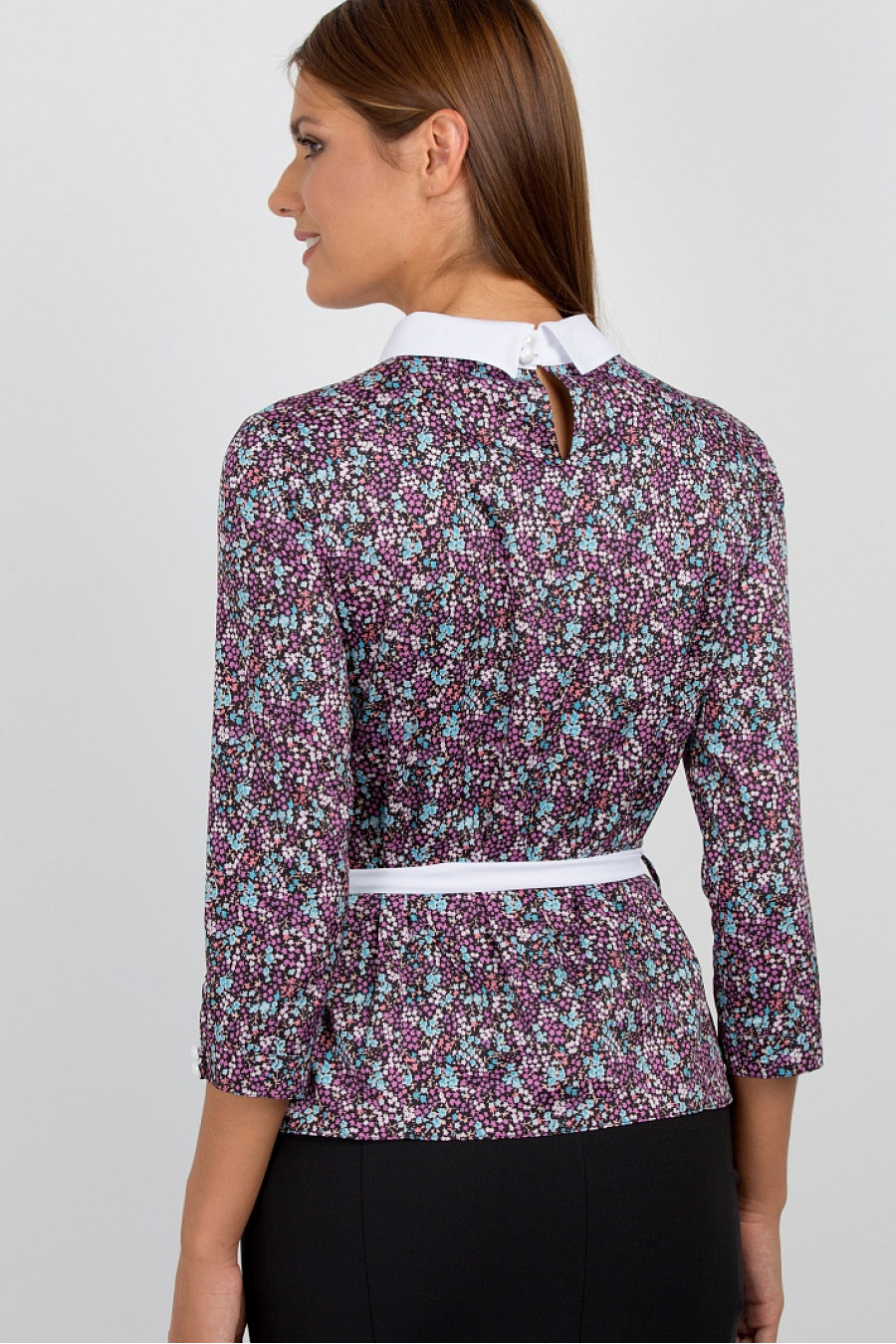 Стильная блузка с застежкой на пуговицы на воротнике изделия, отложным воротником и рукавами 3/4. Воротник не съемный, пояс входит в комплект. Модель выполнена в классическом дизайне. Покрой приталенный. Модель украшена оригинальным принтом.