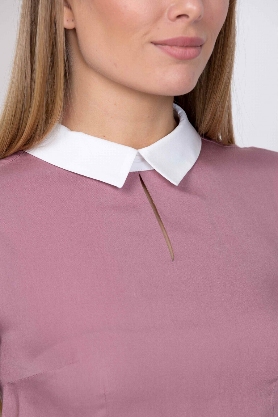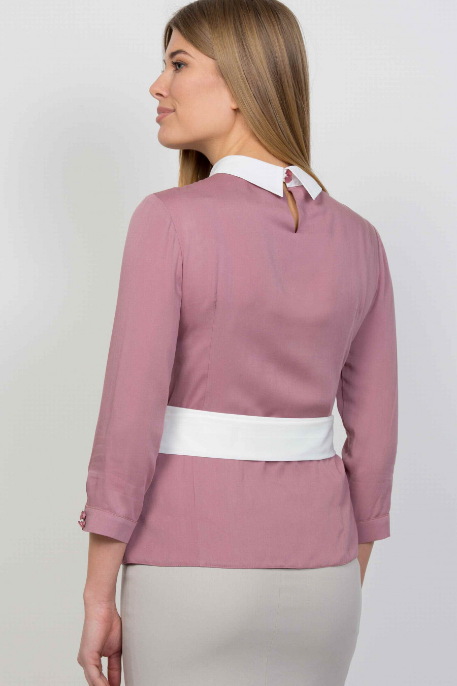 Лилово-розовая блузка полуприлегающего силуэта с аккуратным белым воротничком. Ткань легкая, эластичная с эффектом глянца, приятная к телу. Рукав 3/4 с манжетой на двух пуговицах. По бокам есть шлевки, в комплекте идет белый пояс. Спереди у горловины блузка украшена вырезом в виде капли, воротничок застегивается на две пуговицы. Идеально сочетается с классическими юбками кроя «карандаш». Образ на фотографии дополняет юбка 558/ruslana. Рост фотомодели 170 см.