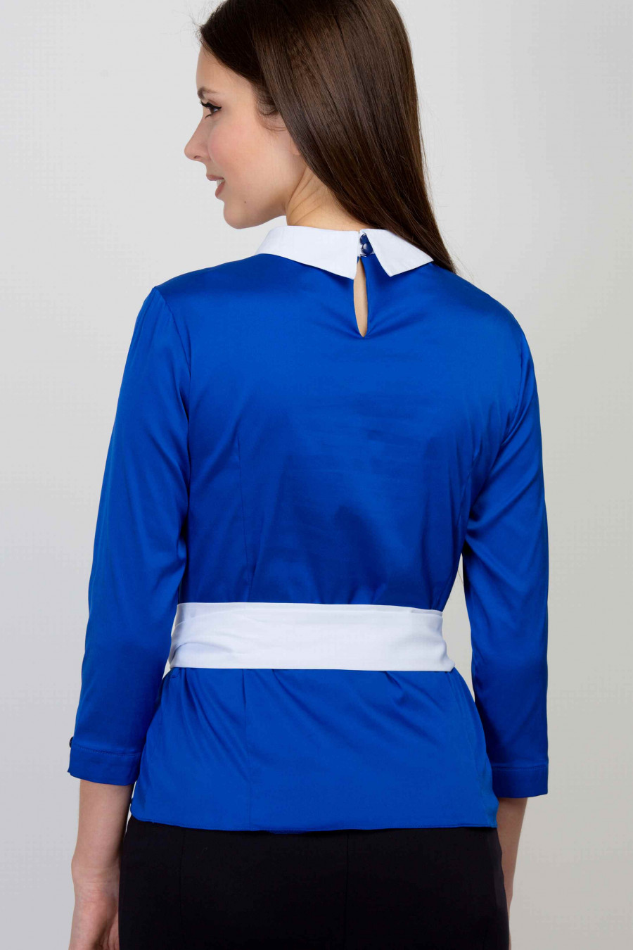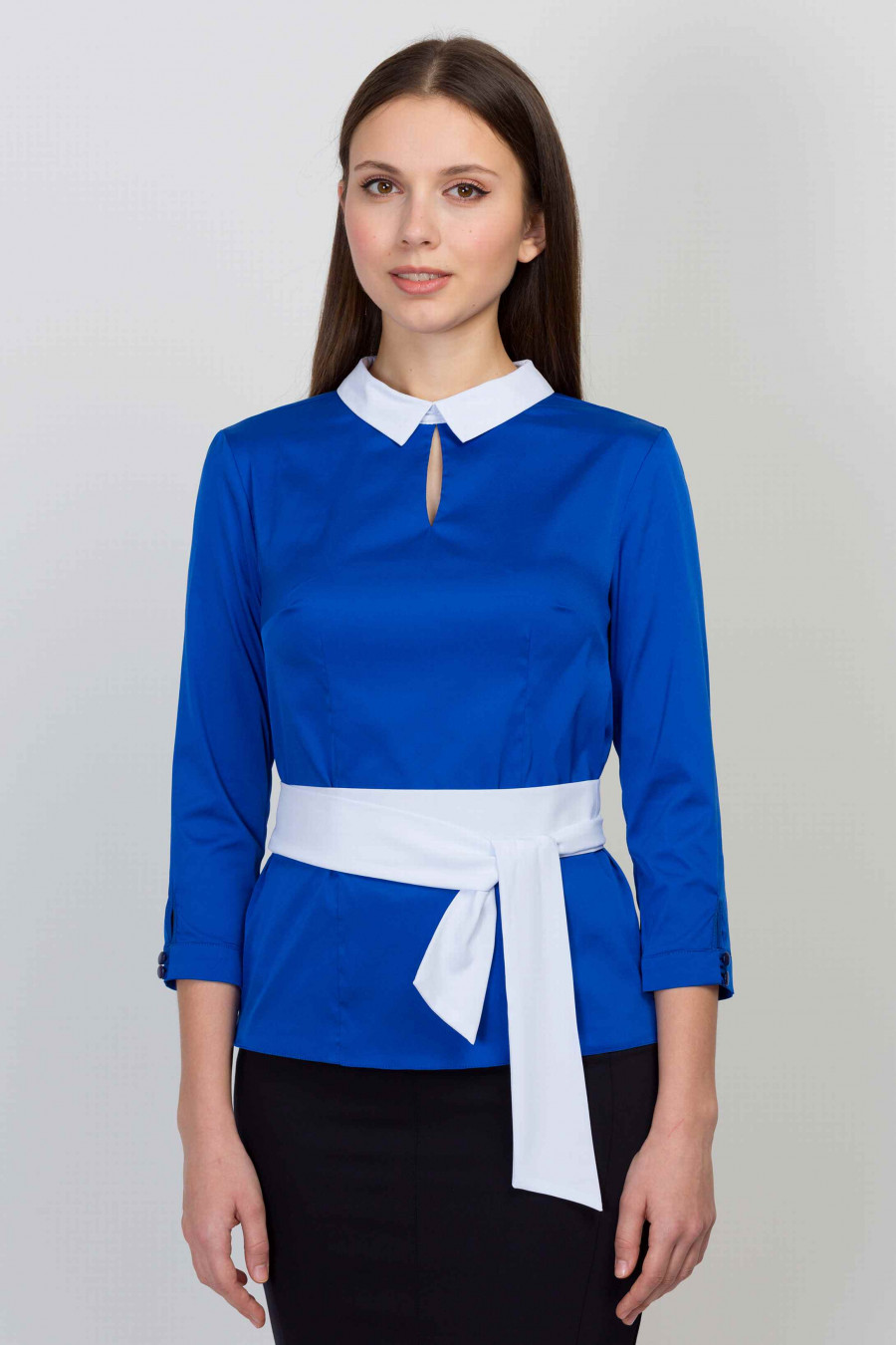 Блузка цвета электрик полуприлегающего силуэта с аккуратным белым воротничком. Ткань легкая, эластичная с эффектом глянца, приятная к телу. Рукав 3/4 с манжетой на двух пуговицах. По бокам есть шлевки, в комплекте идет белый пояс. Спереди у горловины блузка украшена вырезом в виде капли, воротничок застегивается на две пуговицы. Идеально сочетается с классическими юбками кроя «карандаш».