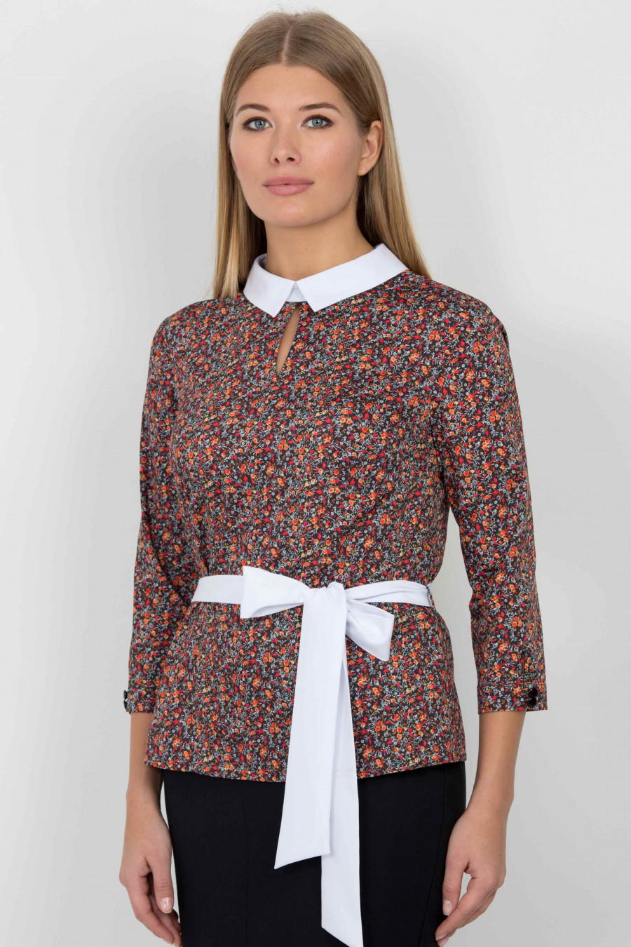 Стильная блузка с застежкой на пуговицы на воротнике изделия, отложным воротником и рукавами 3/4. Воротник не съемный, пояс входит в комплект. Модель выполнена в классическом дизайне. Покрой приталенный. Модель украшена оригинальным принтом.
