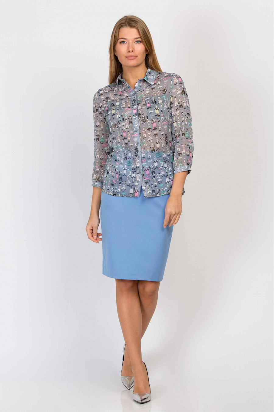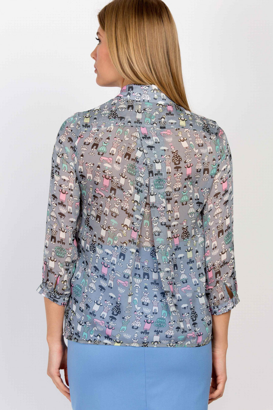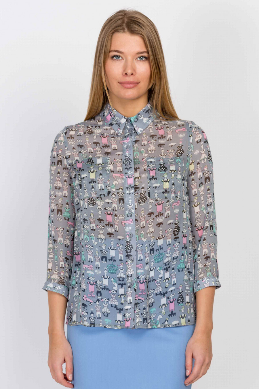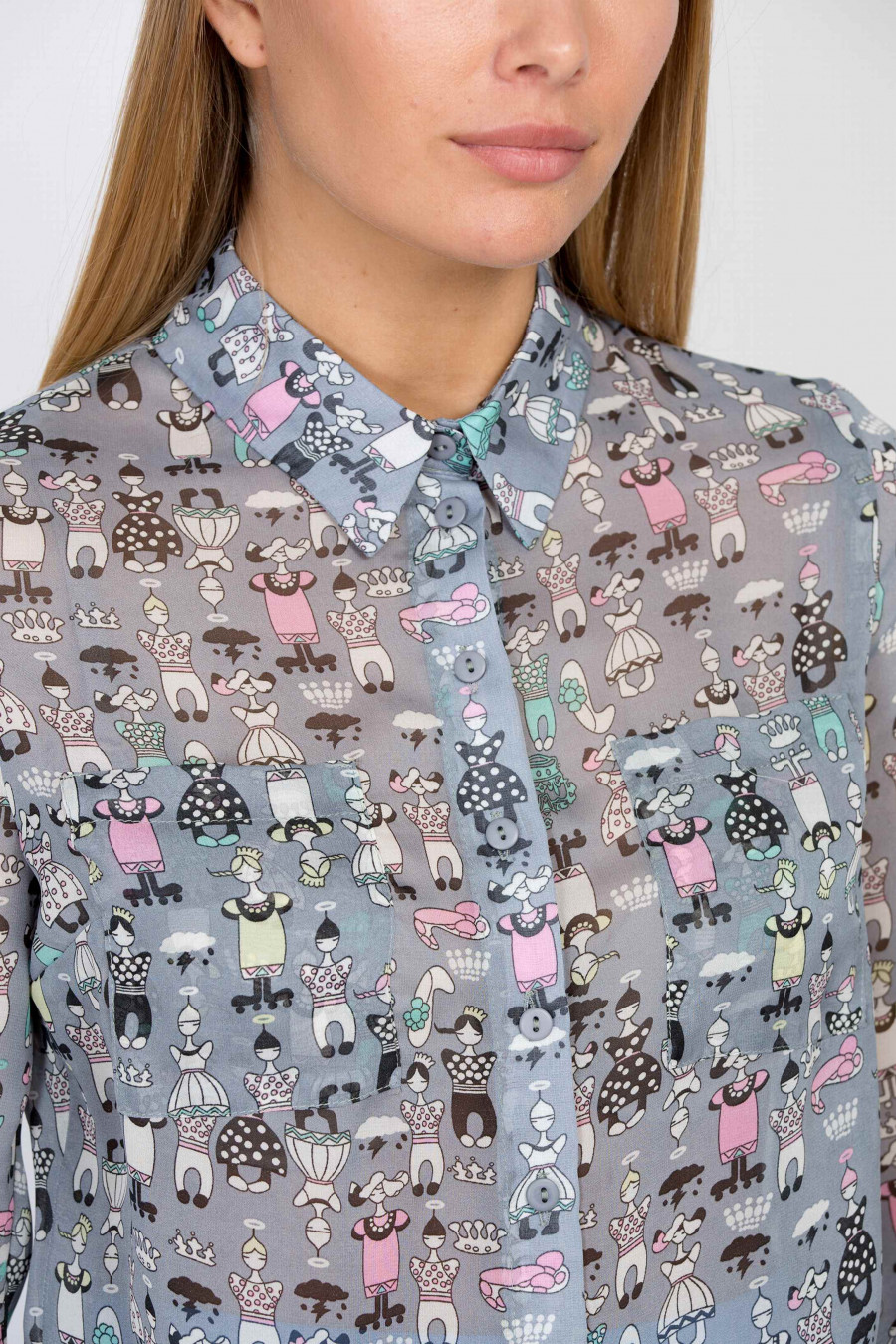 Легкая шифоновая блузка с аккуратным воротничком. Ткань серого цвета с ярким необычным принтом, просвечивает. Блузка застегивается на пуговицы в тон, рукава слегка укороченные с манжетами. Спереди два функциональных кармашка. Очень интересная модель, по фигуре садится свободно, неприхотлива в носке. Такая блузка поможет создать стильный неординарный образ.