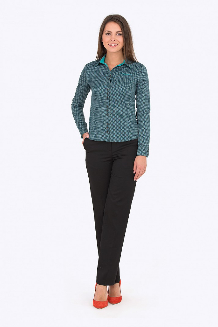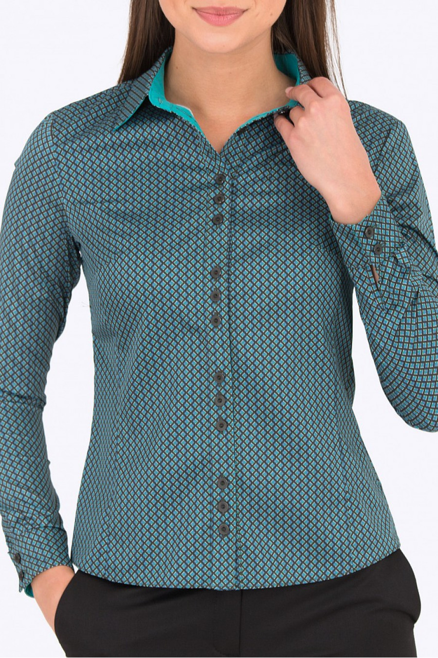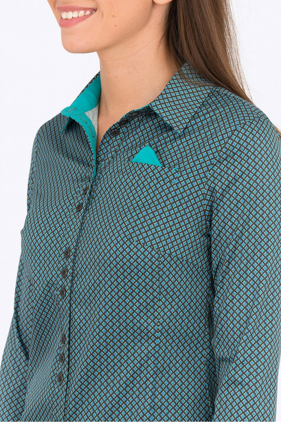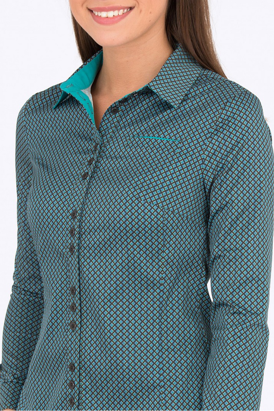 Коричневая рубашка с классическим воротничком. Ткань с зелено-голубым принтом - гладкая, эластичная,очень приятная к телу. Рубашка спереди оформлена небольшим функциональнымкармашком.Благодаря аккуратным рельефамрубашка хорошо сидит по фигуре, подчеркивает талию. Отличная модель для офиса.