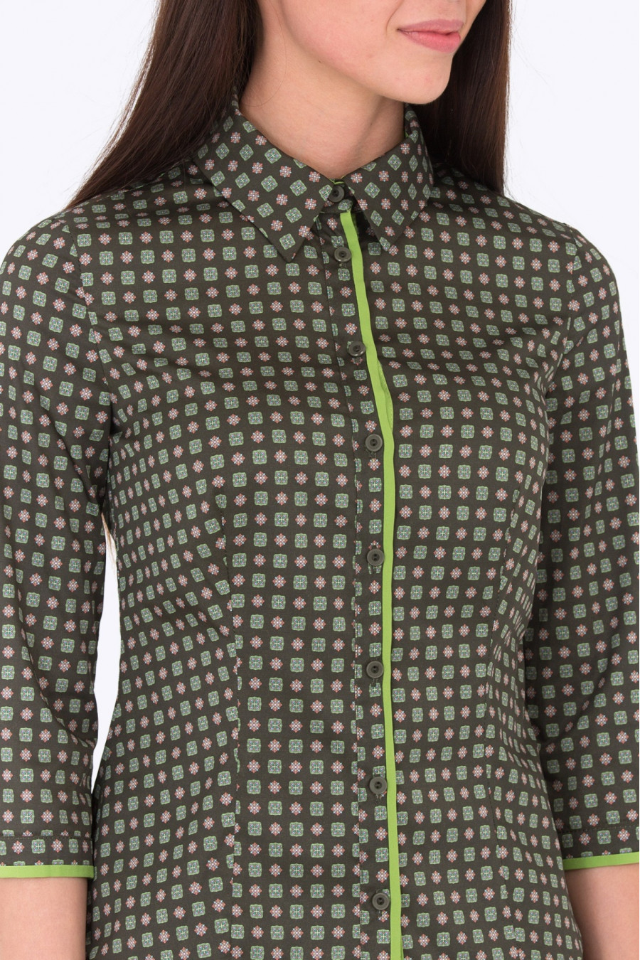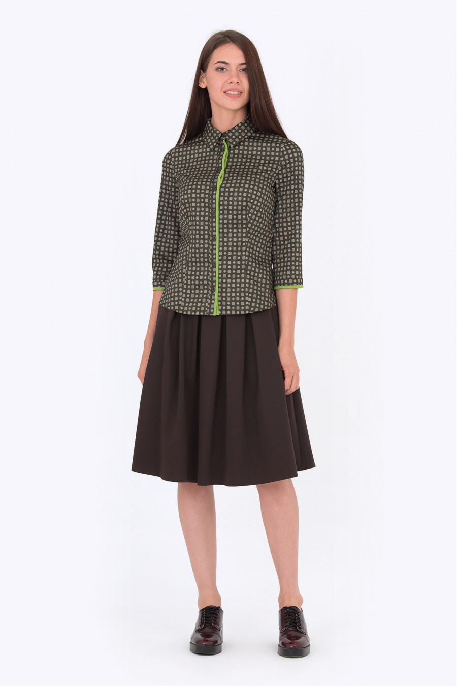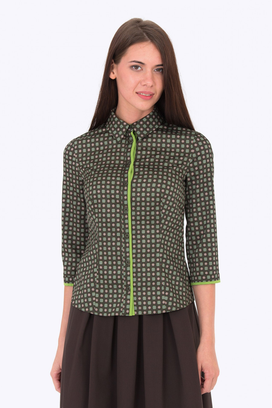 Приталенная рубашка темно-коричневого цвета с мелким принтом. Рукава 3/4 с манжетами, оформленными зеленой окантовкой. Стильная деталь - классический воротничок и планка с пуговицами, оформленная зеленой окантовкой. Очень комфортная в носке модель, хорошо сидит по фигуре.