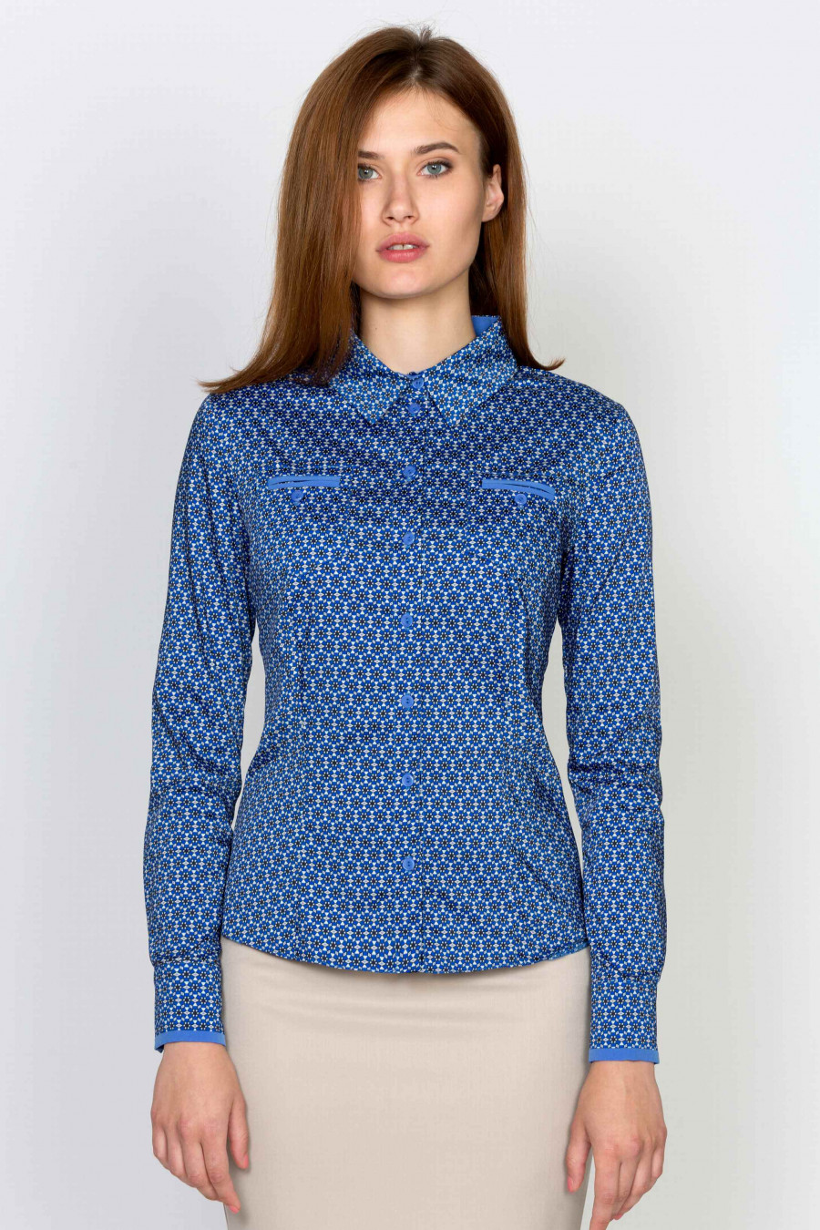 Яркая приталенная рубашка с сине-бежевым принтом. Ткань эластичная, приятная к телу. Спереди оформлена небольшими функциональными кармашками на пуговицах. Блузка неприхотливая в носке, отлично подойдет для офиса. Элегантно смотрится в комплекте с бежевой классической юбкой. Образ на фотографии дополняет юбка 202-50-leontiya.