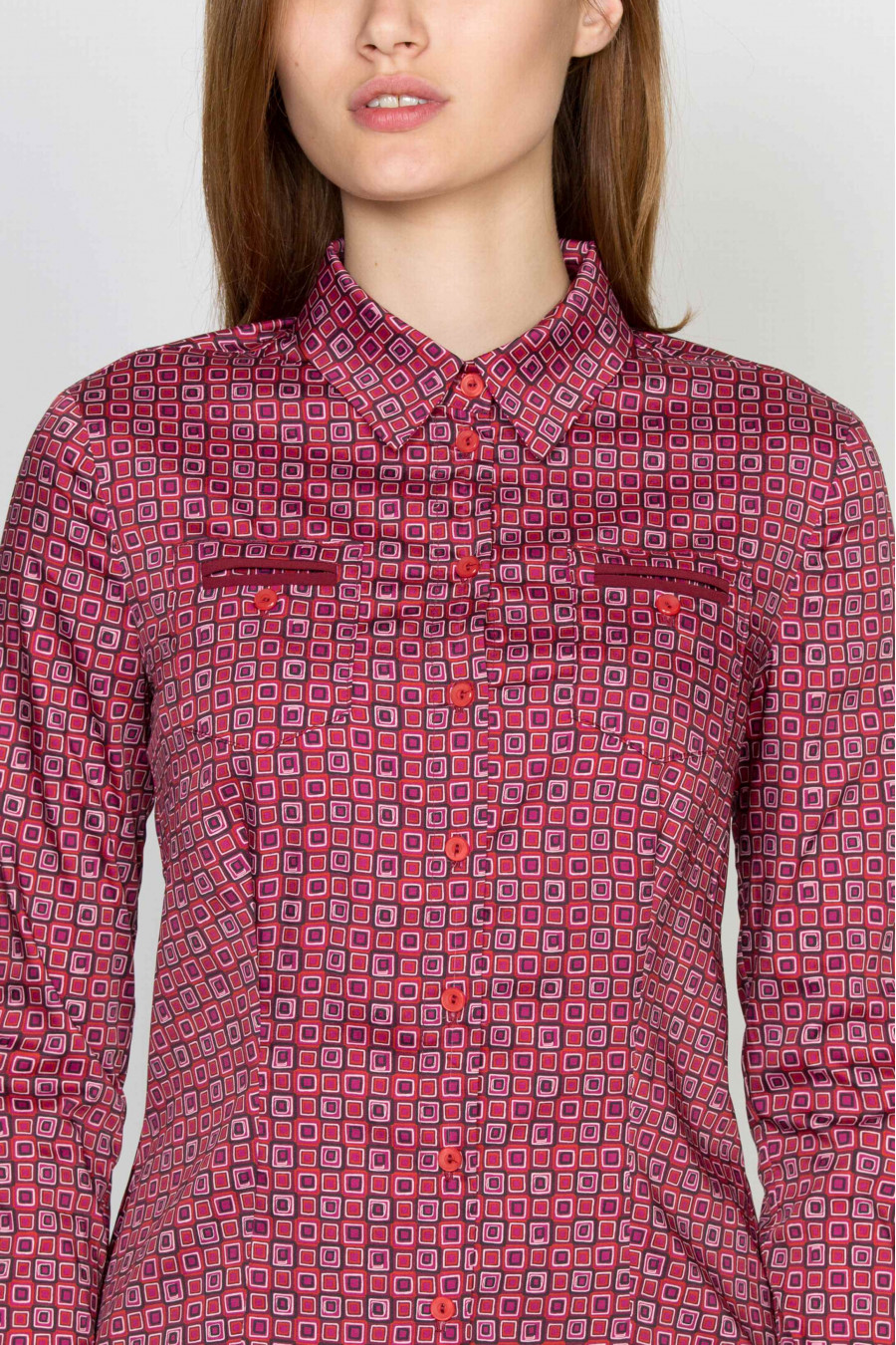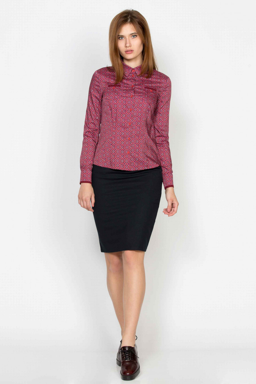 Яркая приталенная рубашка с бордово-фиолетовым принтом. Ткань эластичная, приятная к телу. Спереди оформлена небольшими функциональными кармашками на пуговицах. Блузка неприхотливая в носке, отлично подойдет для офиса. Элегантно смотрится в комплекте с черной классической юбкой.