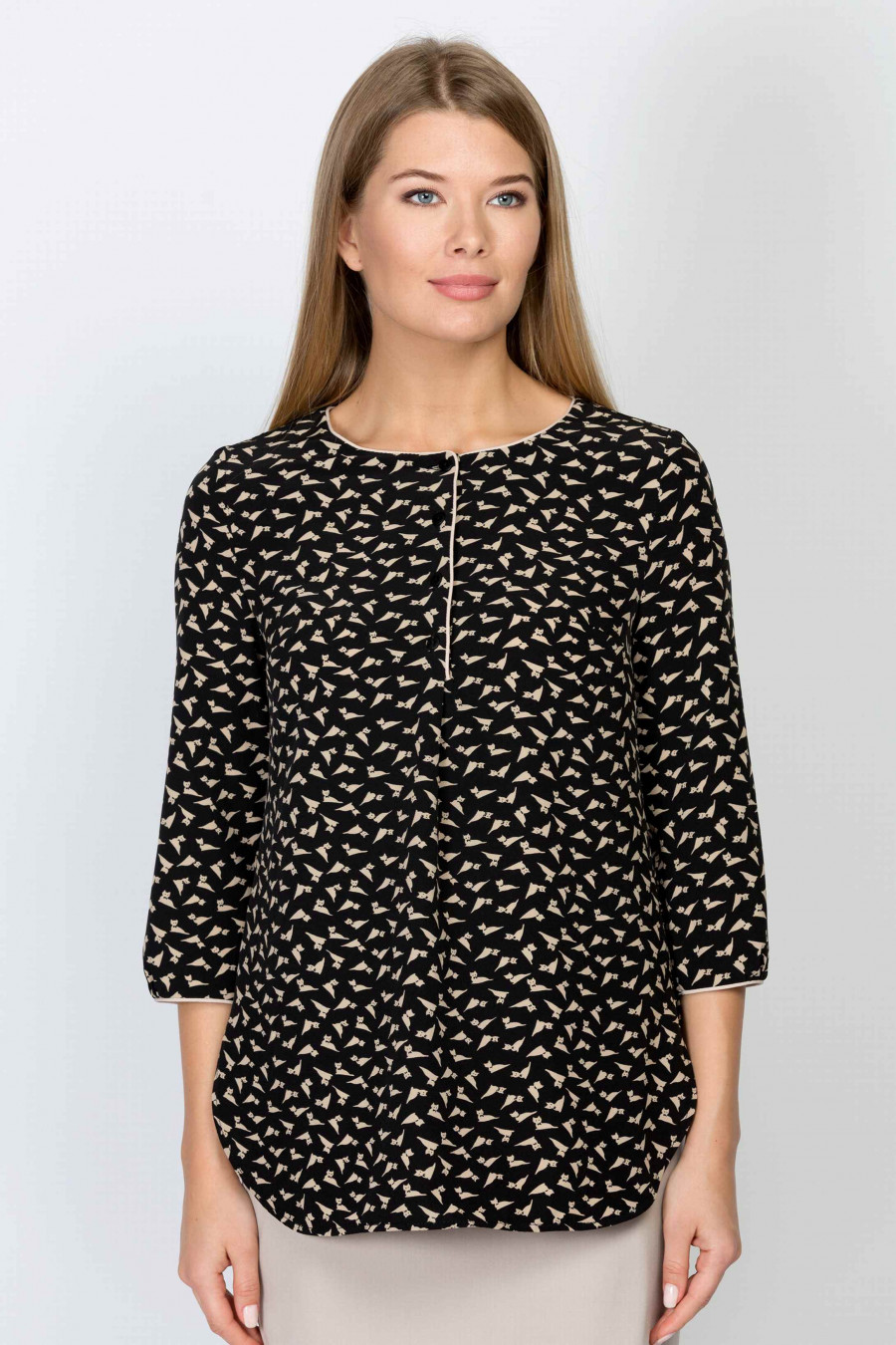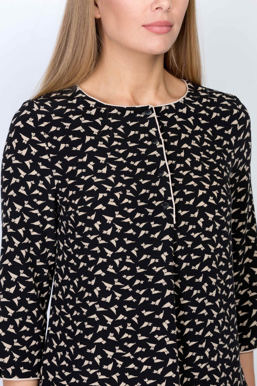Легкая блузка с оригинальным принтом в виде бежевых кошек. Ткань черного цвета мягкая, приятная к телу. Блузка хорошо сидит по фигуре, благодаря свободному крою и кругленному низу. Отличный вариант для повседневной носки.