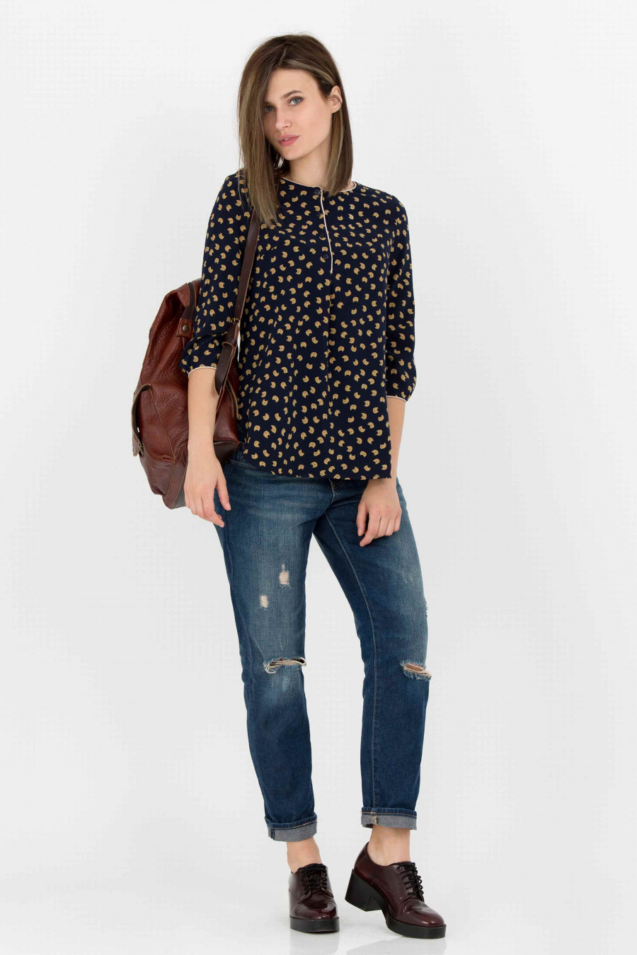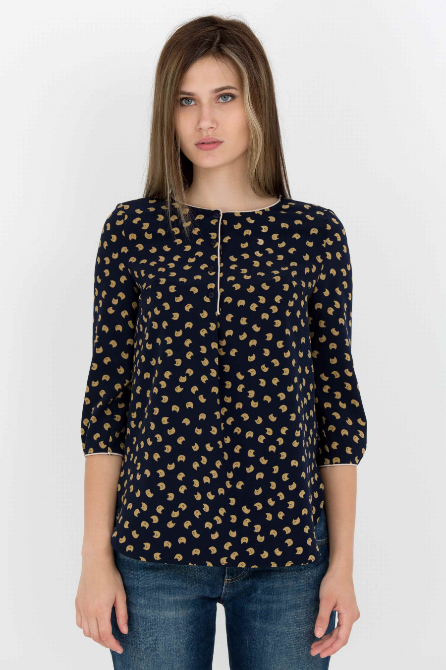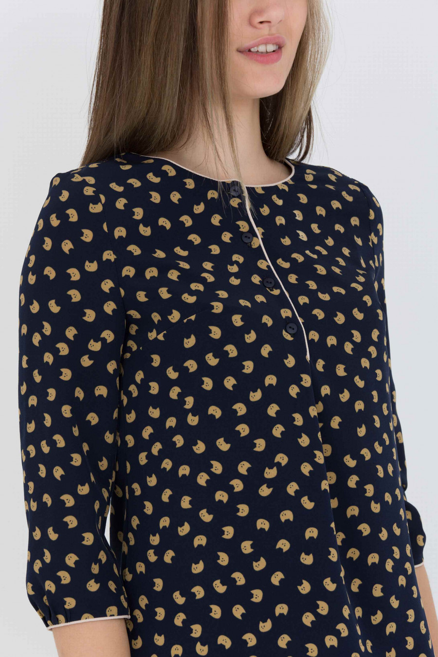 Легкая блузка с оригинальным принтом в виде бежевых кошек. Ткань темно-синего цвета, мягкая, приятная к телу. Блузка хорошо сидит по фигуре, благодаря свободному крою и кругленному низу. Отличный вариант для повседневной носки.