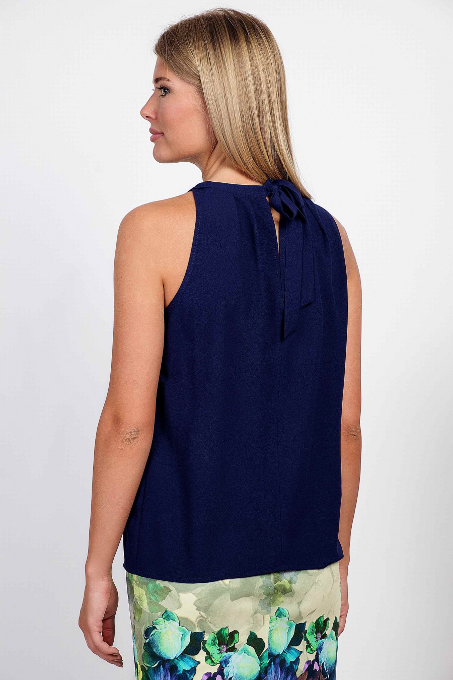 Темно-синий шифоновый топ средней плотности, очень приятный к телу. Легкая, с мягкими сборками на горловине, слегка просвечивает. Завязывается сзади на лямках, есть аккуратный небольшой разрез на спинке. В сочетании с классической юбкой кроя «карандаш» отлично подойдет для офиса, а с расклешенной юбкой поможет создать легкий образ для романтичного свидания. Образ на фотографии дополняет юбка 202-60/donora. Рост фотомодели 170 см.