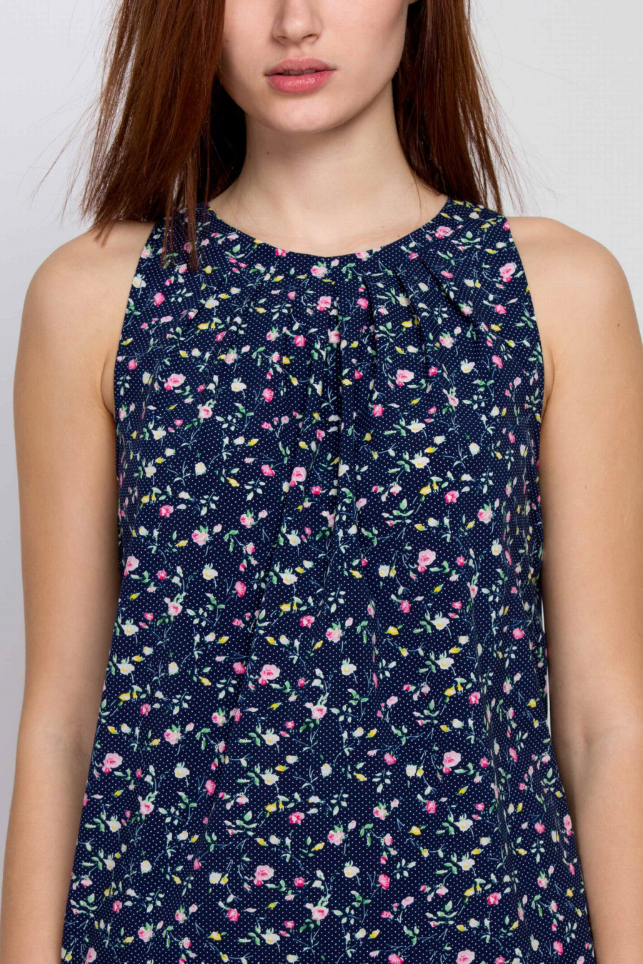 Стильный топ из ткани средней плотности, очень приятный к телу. Цвет темно-синий с нежным цветочным принтом. Топ с мягкими сборками на горловине, слегка просвечивает. Завязывается сзади на лямках, есть аккуратный небольшой разрез на спинке. Хорошо сочетается с классическими однотонными юбками-карандаш, а с расклешенной юбкой поможет создать летний образ для романтичного свидания.