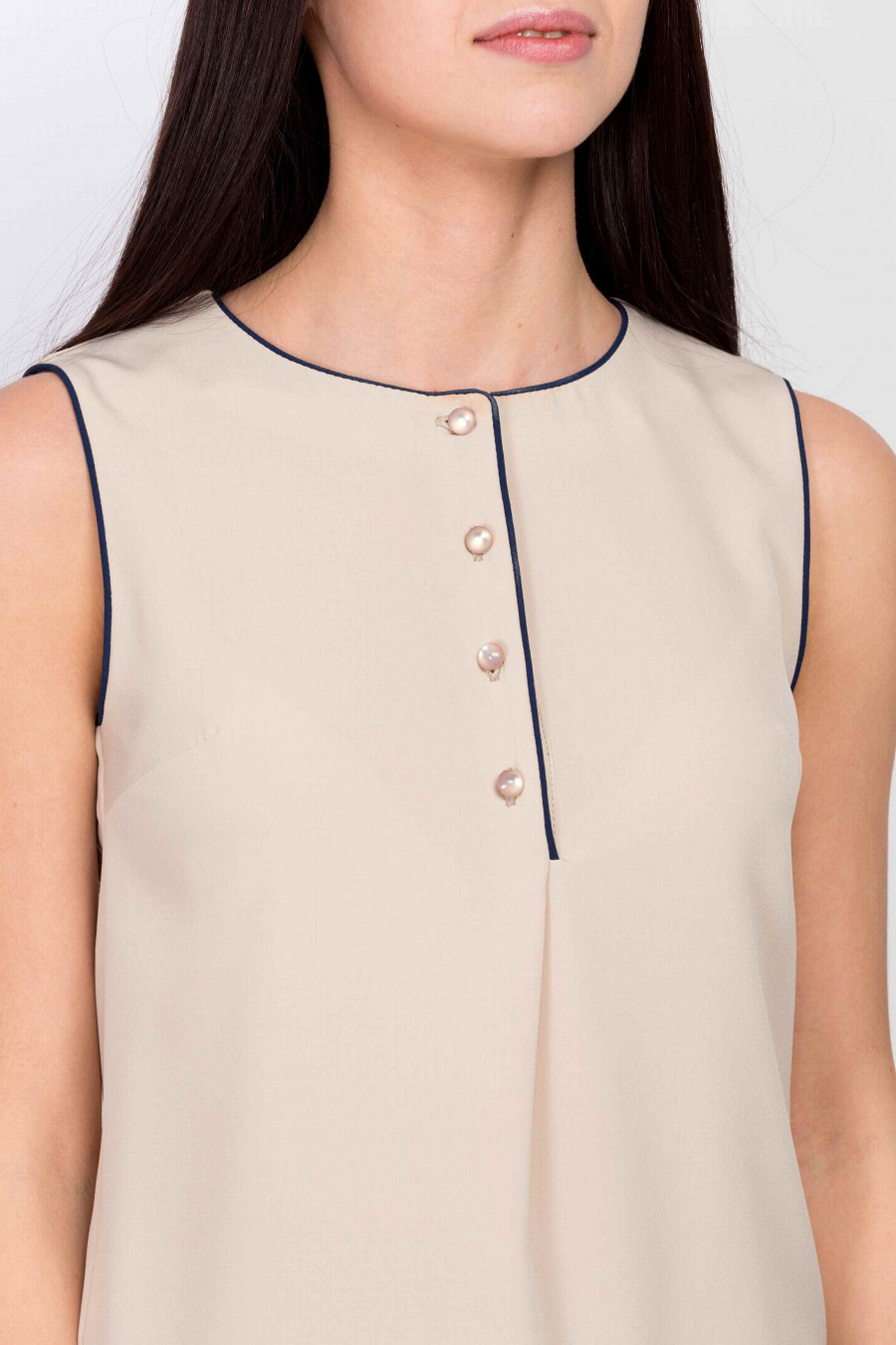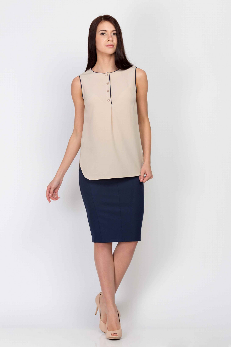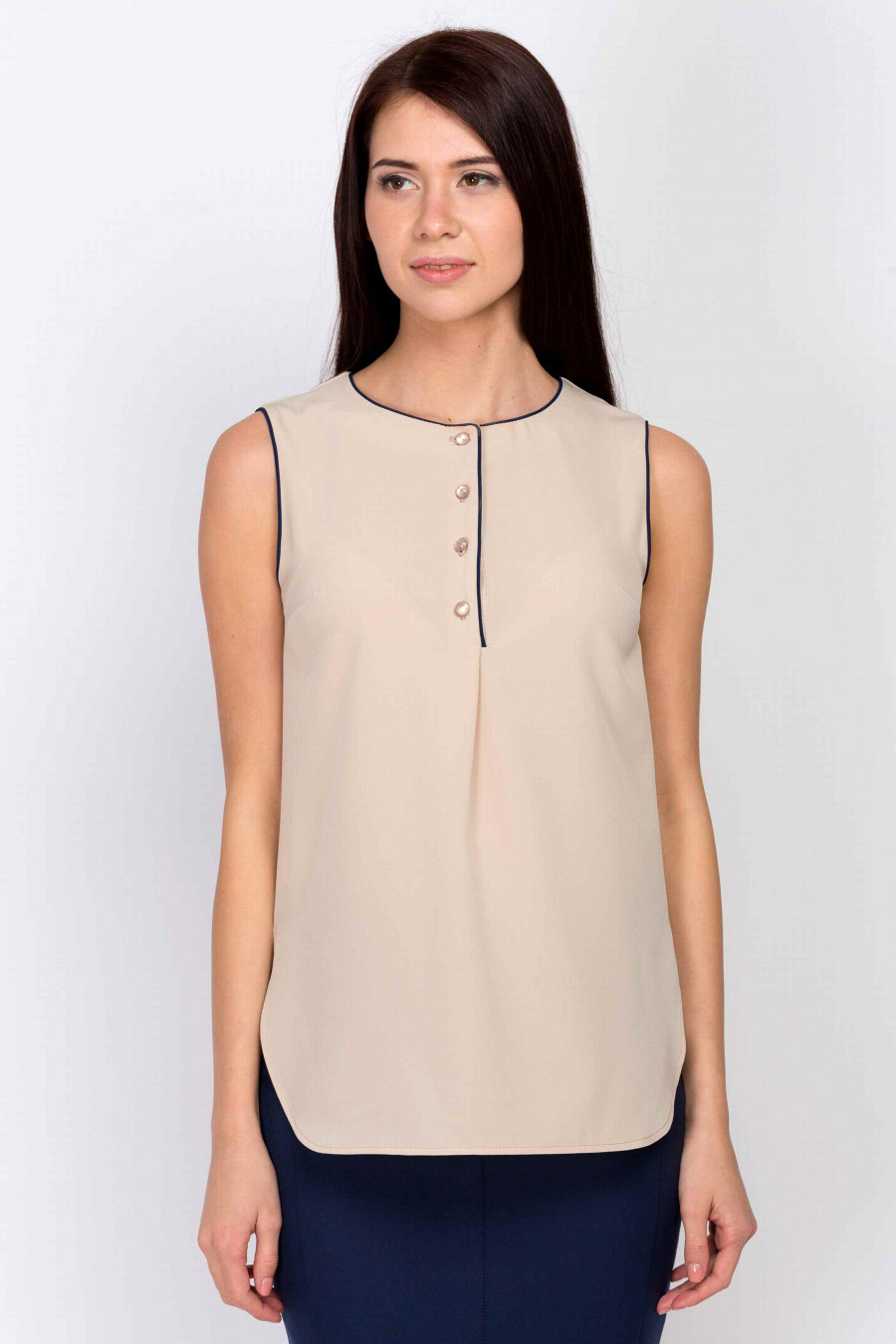 Легкая блузка свободного кроя с закругленным низом и аккуратными разрезами по бокам. Ткань мягкая, приятная к телу бежевого цвета. Блузка спереди декорирована планкой на пуговицах, пройма, горловина и планка отделаны темно-синим кантом. Блузка идеально сочетается с темными классическими юбками, хорошо подойдет для офиса.
