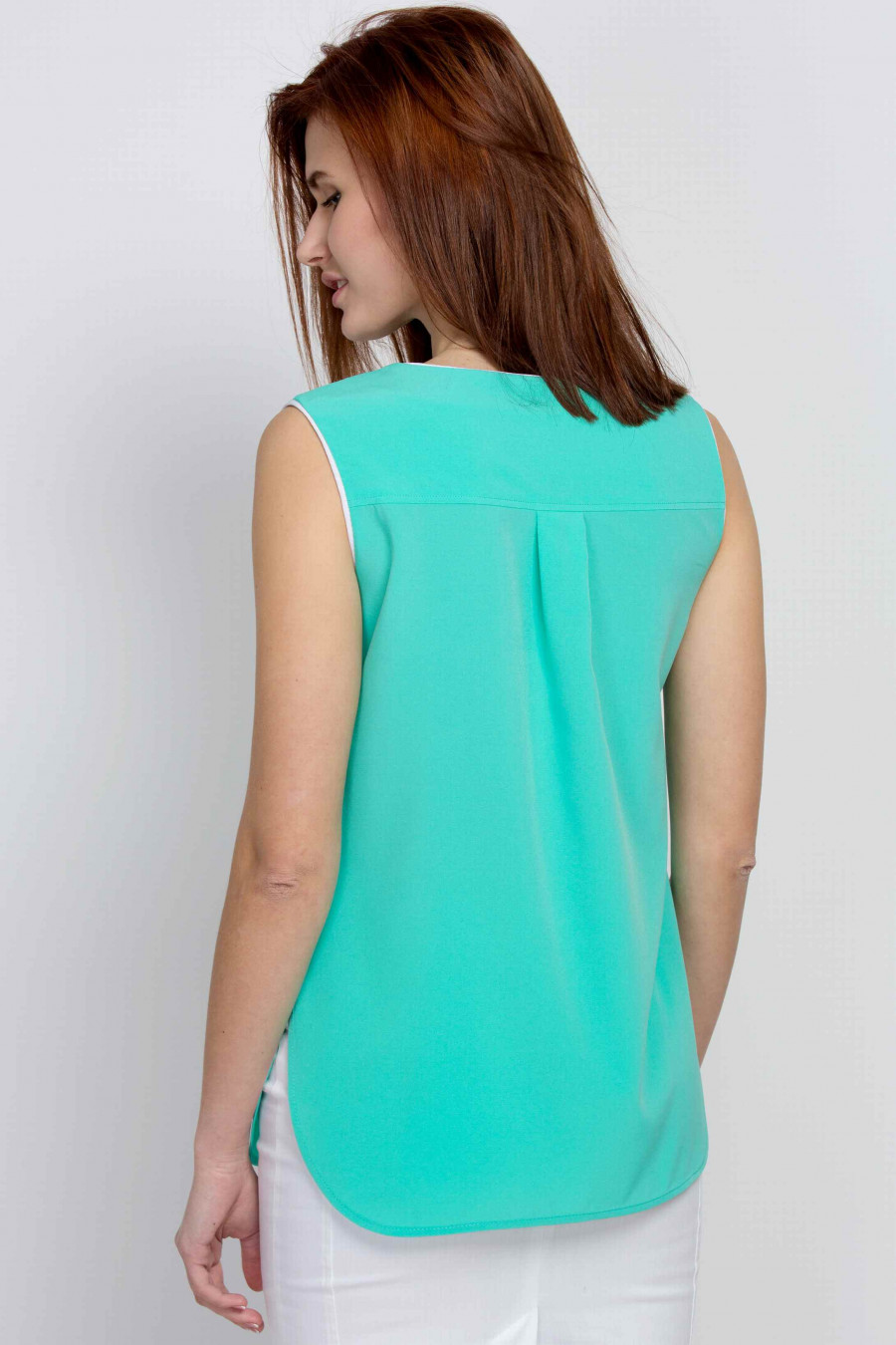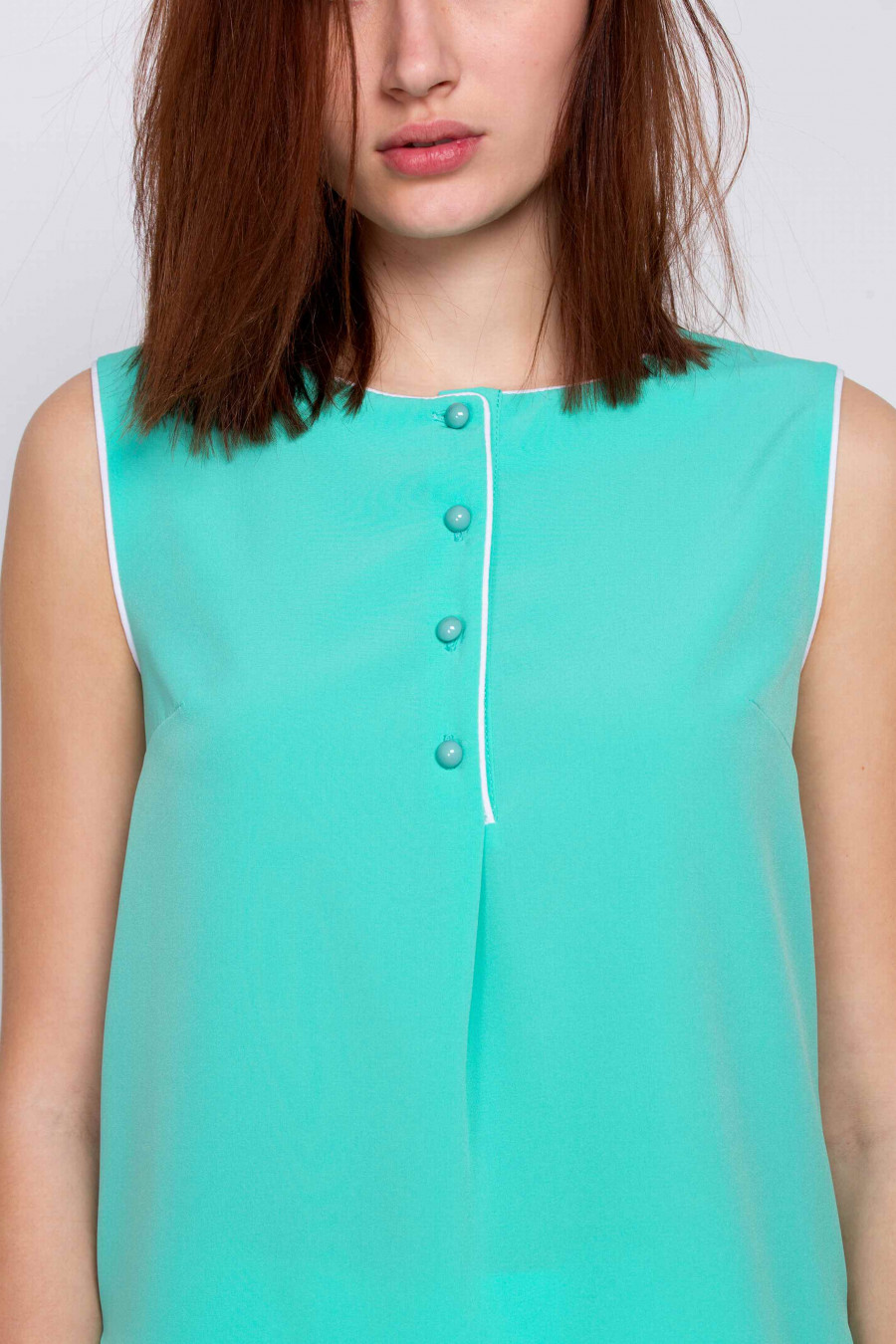 Легкая блузка свободного кроя с закругленным низом и аккуратными разрезами по бокам. Ткань мягкая, приятная к телу мятного цвета. Блузка спереди декорирована планкой на пуговицах, пройма, горловина и планка отделаны белым кантом. Блузка идеально сочетается с белыми классическими юбками, хорошо подойдет для офиса.