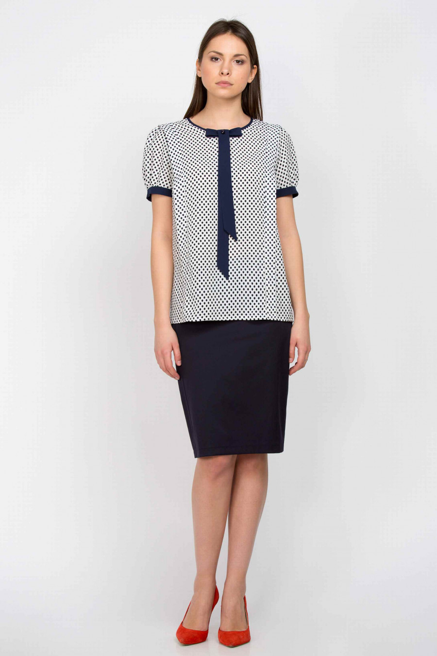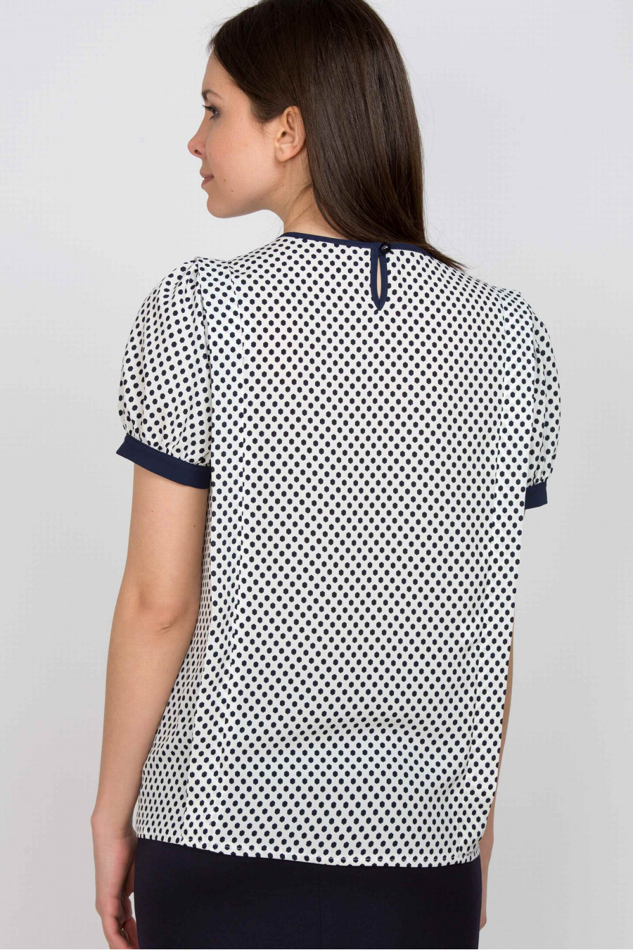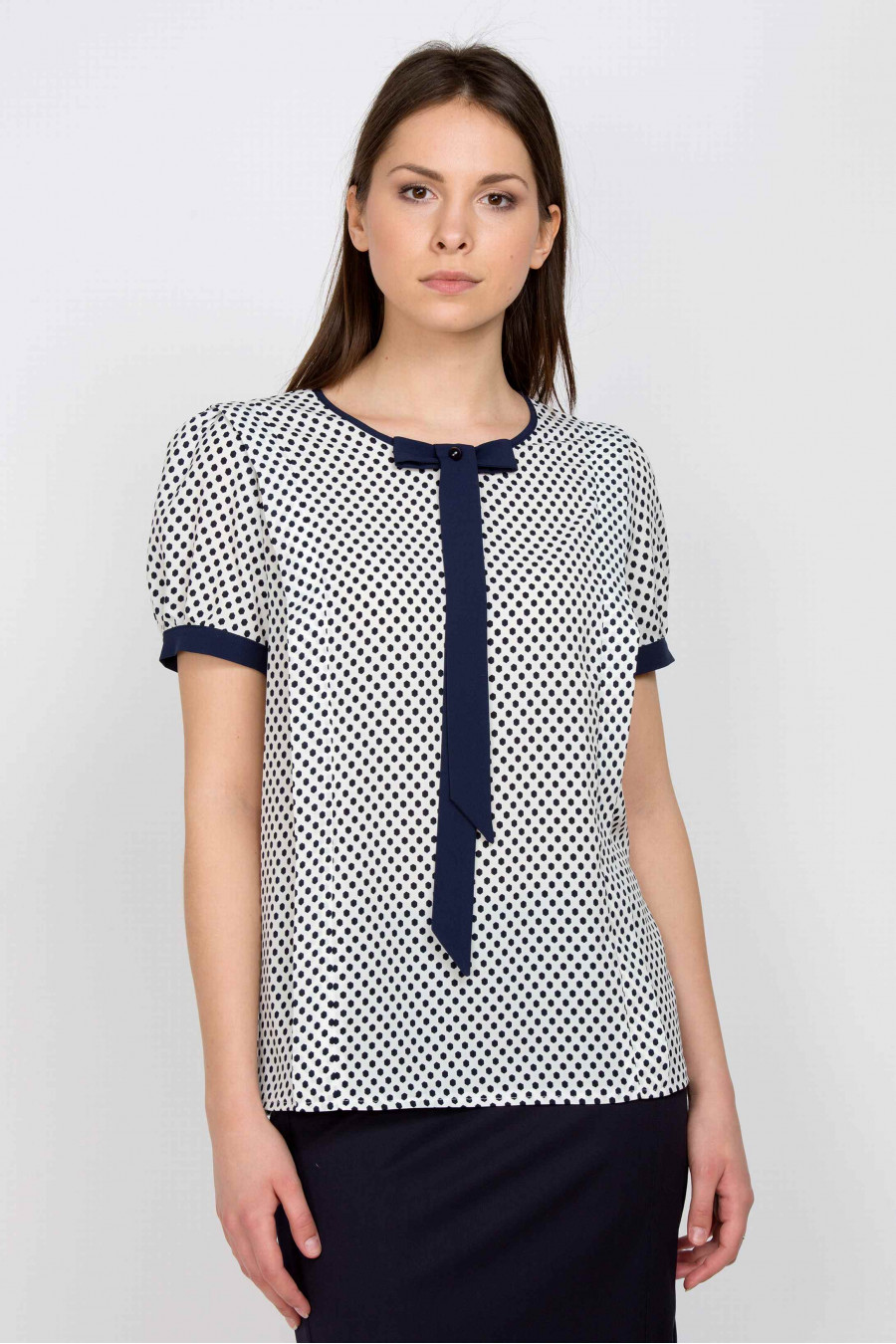 Легкая белая блузка в синий горох, приятная к телу. Рукава-фонарики на манжетах, сзади застежка-капелька на пуговице в тон. Спереди украшена аккуратным синим бантом. Блузка очень комфортная, хорошо сидит по фигуре, отлично подойдет для сезона весна-лето.