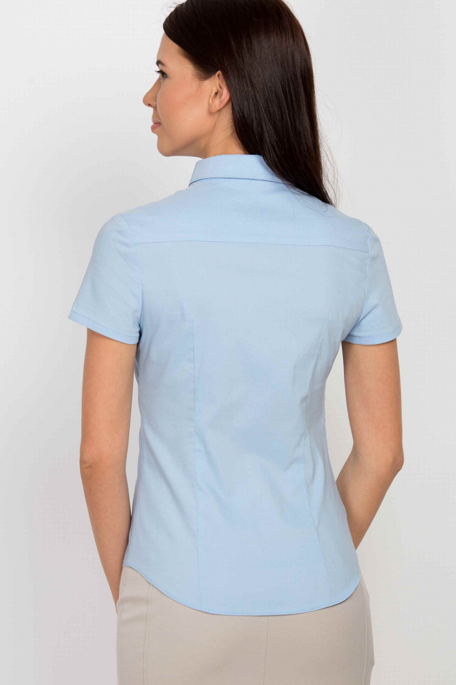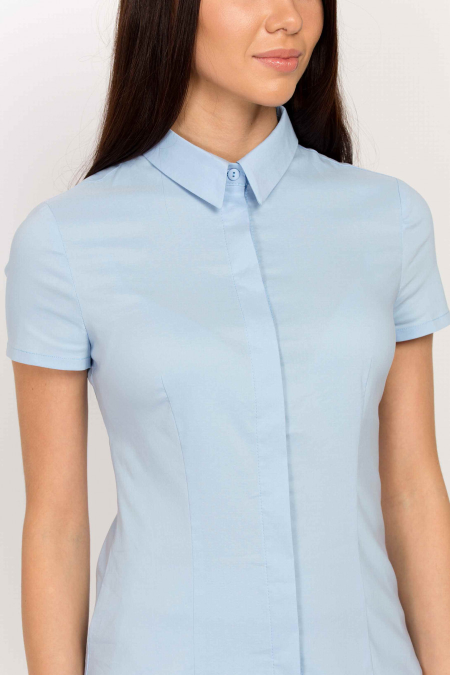 Пастельно-голубая рубашка с классическим воротничком из натурального хлопка с добавлением лайкры. Ткань гладкая, эластичная с легким эффектом глянца, очень приятная к телу. Рубашка спереди оформлена планкой со скрытыми пуговицами в тон. Рукав короткий. Благодаря аккуратным рельефам, рубашка хорошо сидит по фигуре, подчеркивает талию. Отличная модель для офиса.