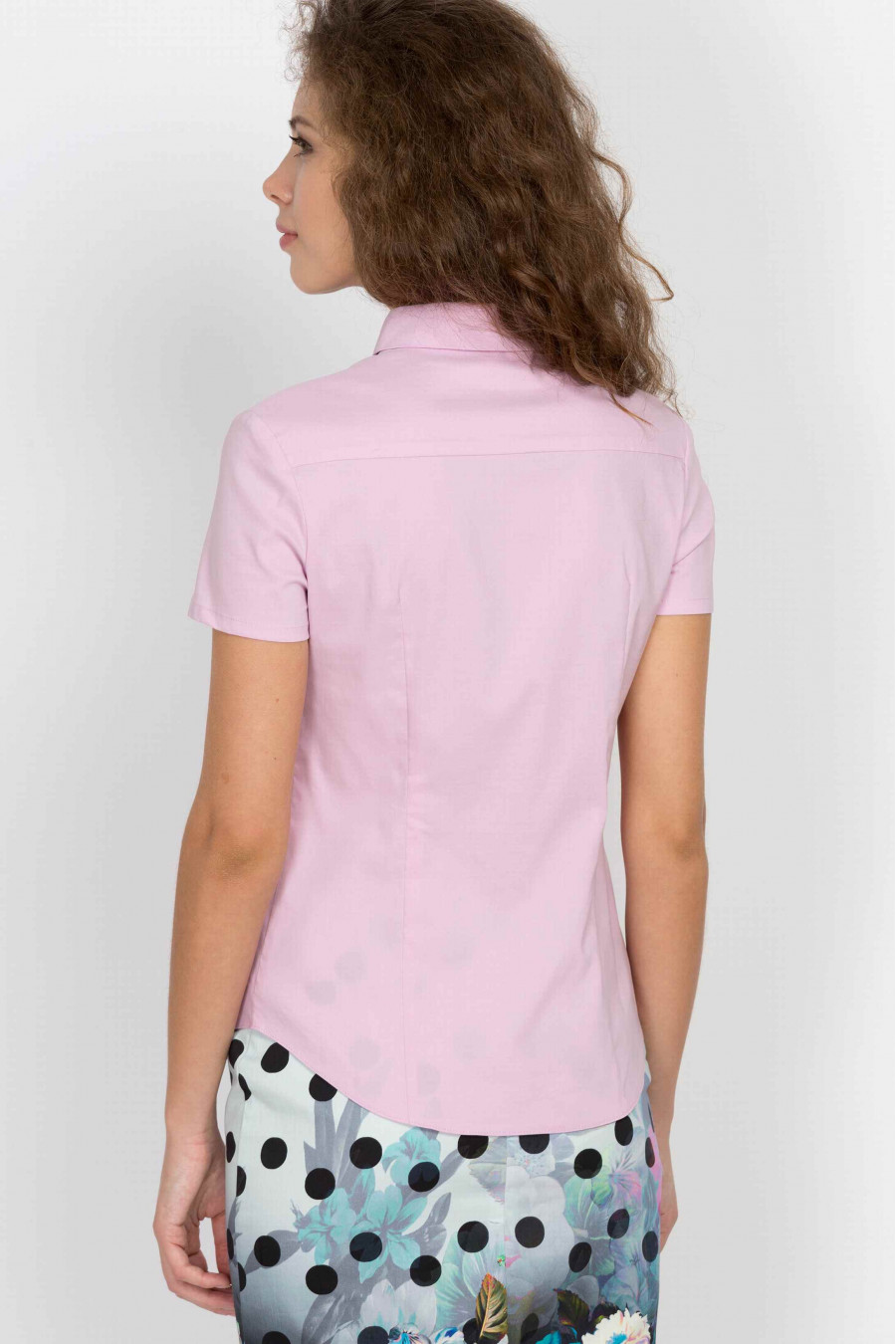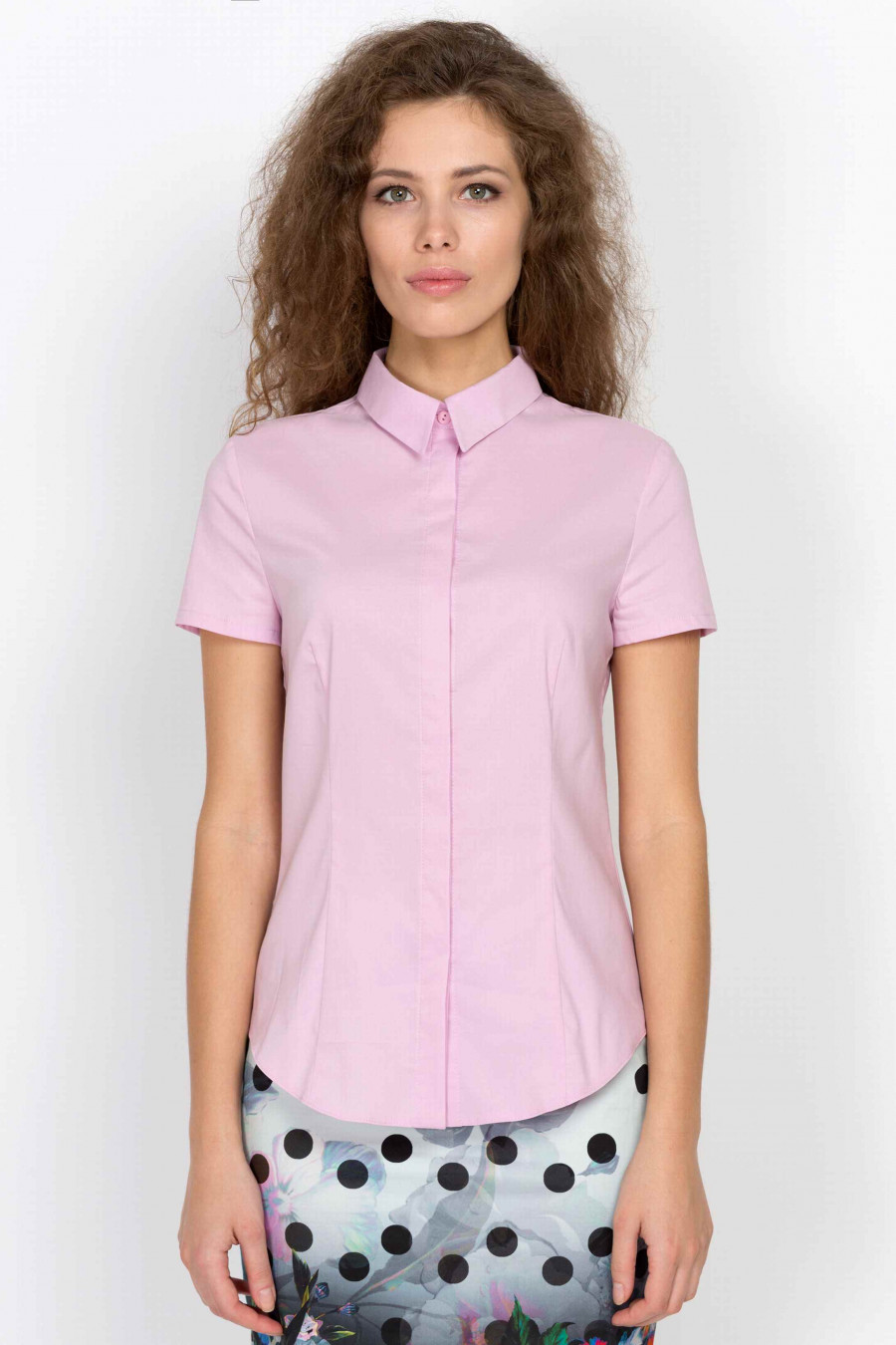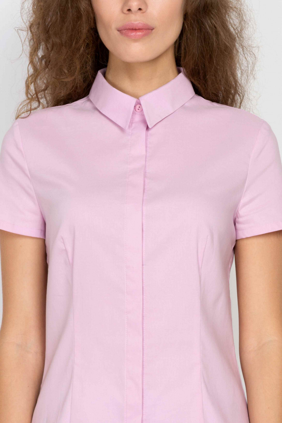 Пастельно-розовая рубашка с классическим воротничком из натурального хлопка с добавлением лайкры. Ткань гладкая, эластичная с легким эффектом глянца, очень приятная к телу. Рубашка спереди оформлена планкой со скрытыми пуговицами в тон. Рукав короткий. Благодаря аккуратным рельефам, рубашка хорошо сидит по фигуре, подчеркивает талию. Отличная модель для офиса.