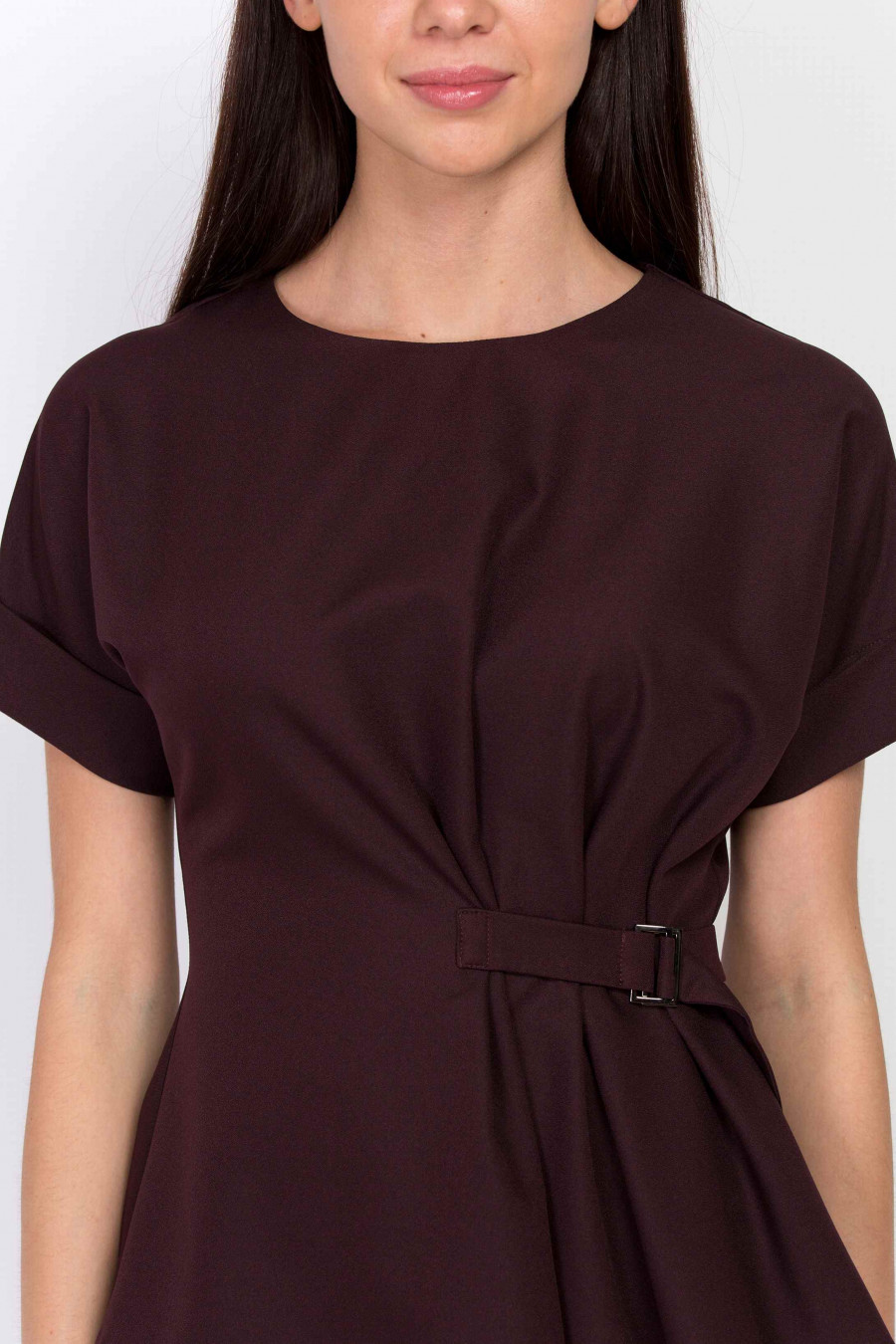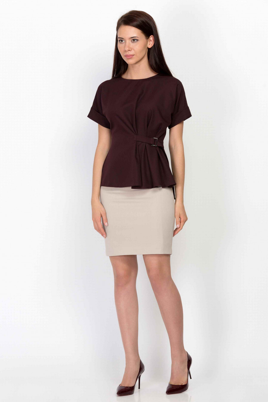 Элегантный ассиметричный блузон. Ткань приятная к телу, эластичная, с легким эффектом глянца. Блузон оформлен аккуратными защипами и поясом с металлической пряжкой, который подчеркивает линию талии. Очень женственная модель, визуально формирует силуэт "песочные часы". Хорошо сочетается с классическими юбками. Образ на фотографии дополняет юбка 202-50/leontiya.