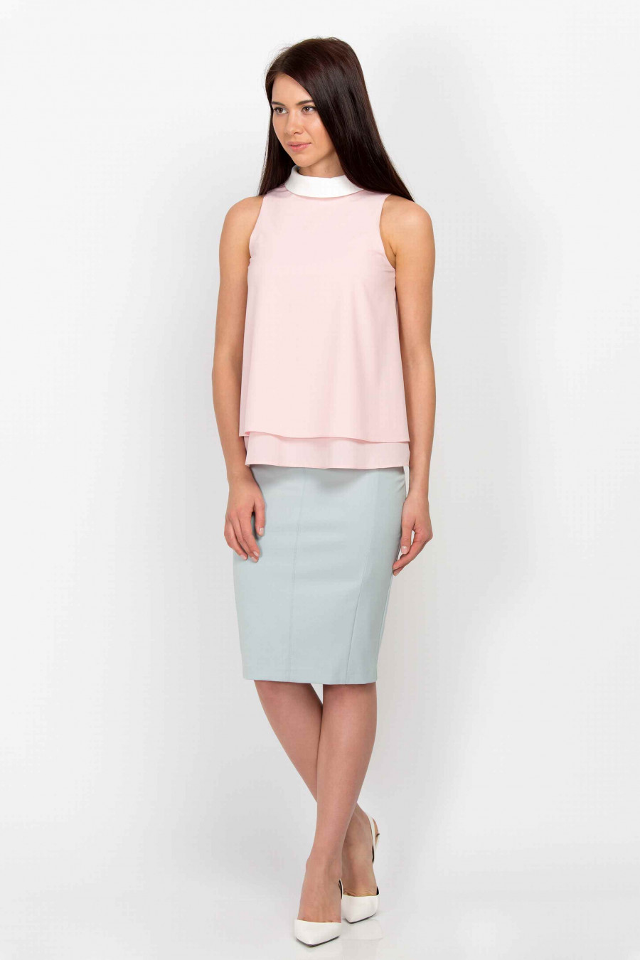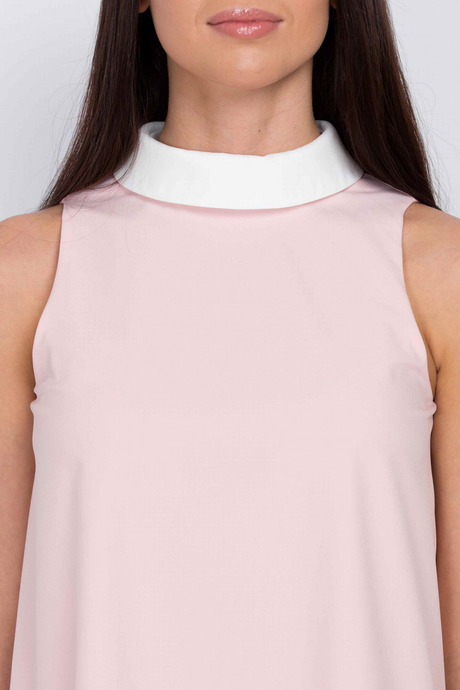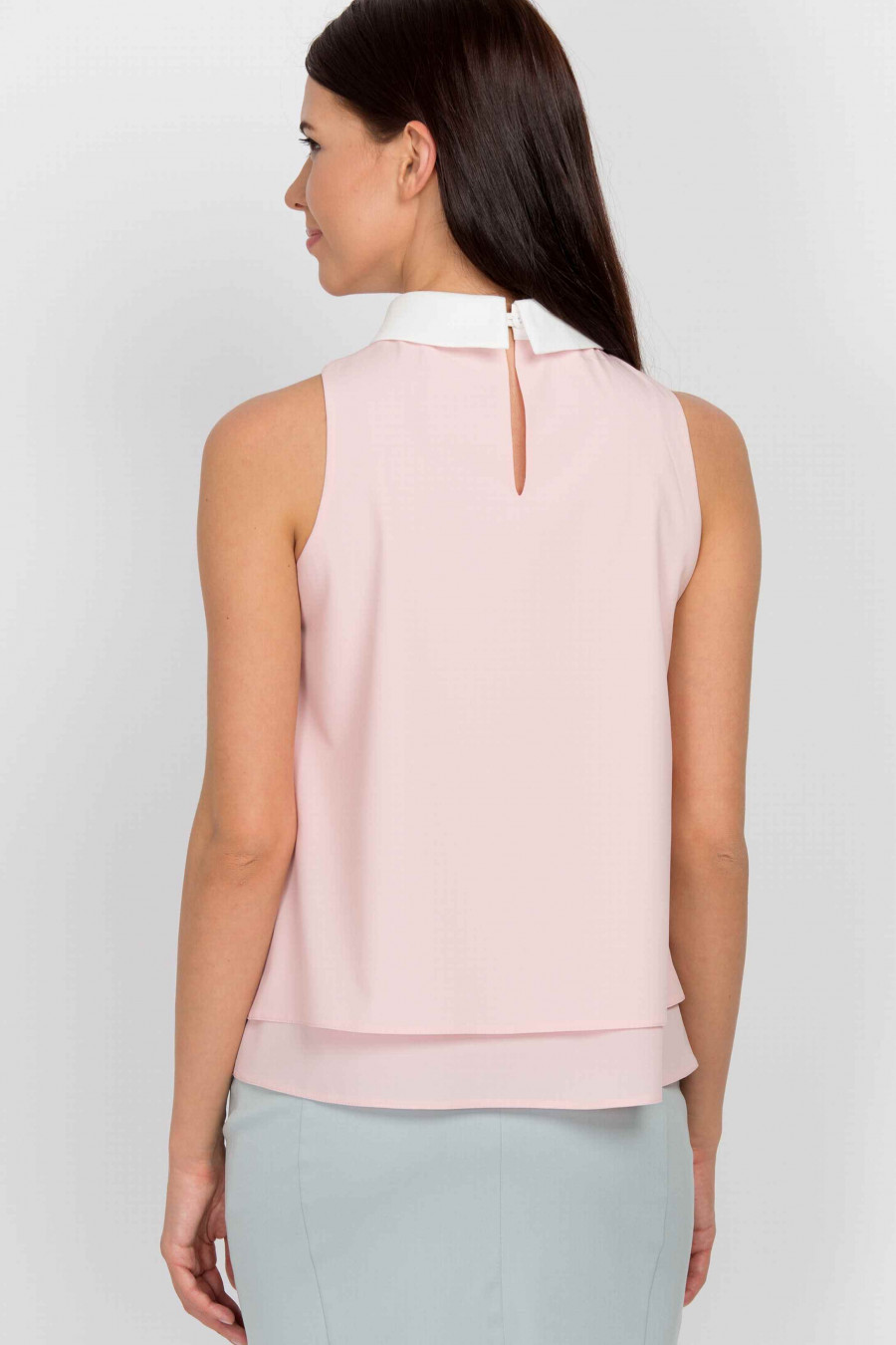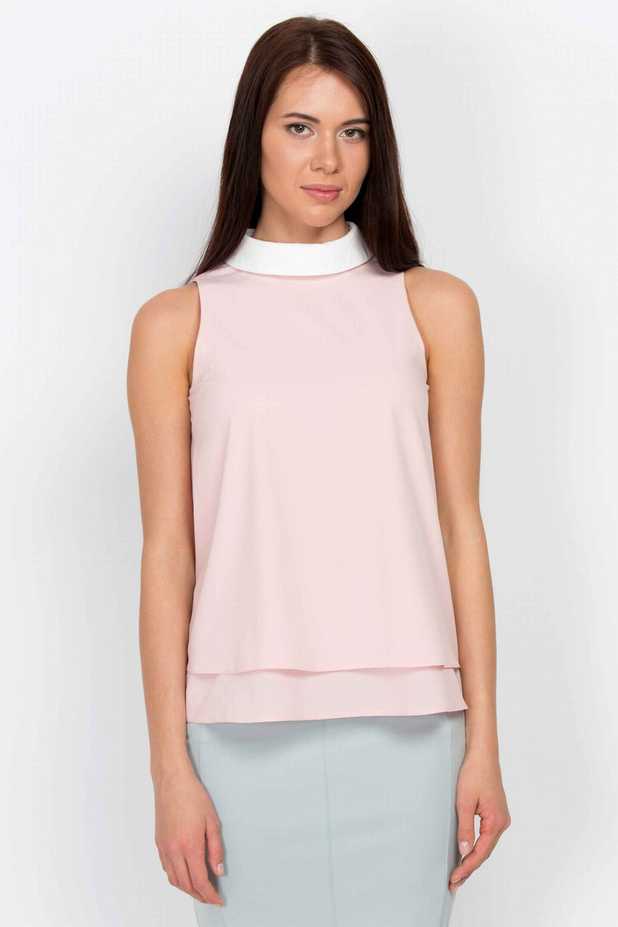 Легкий двуслойный топ свободного кроя. Ткань гладкая, эластичная с легким эффектом глянца мягкого розового цвета. Есть белый воротничок-стойка, который сзади застегивается на пуговицу. Топ хорошо сидит по фигуре, не сковывает движения. Отличная модель для офиса в сочетании с классическими юбками или брюками.
