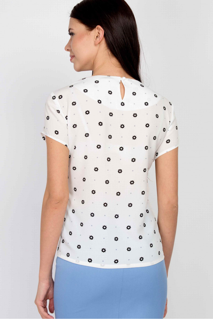 Легкая светлая блузка с черным цветочным принтом. Ткань мягкая, приятная к телу, немного просвечивает. Стильная изюминка блузки - черный закругленный воротник на полочке. Блузка хорошо подойдет для офиса, отлично сочетается с классическими юбками.