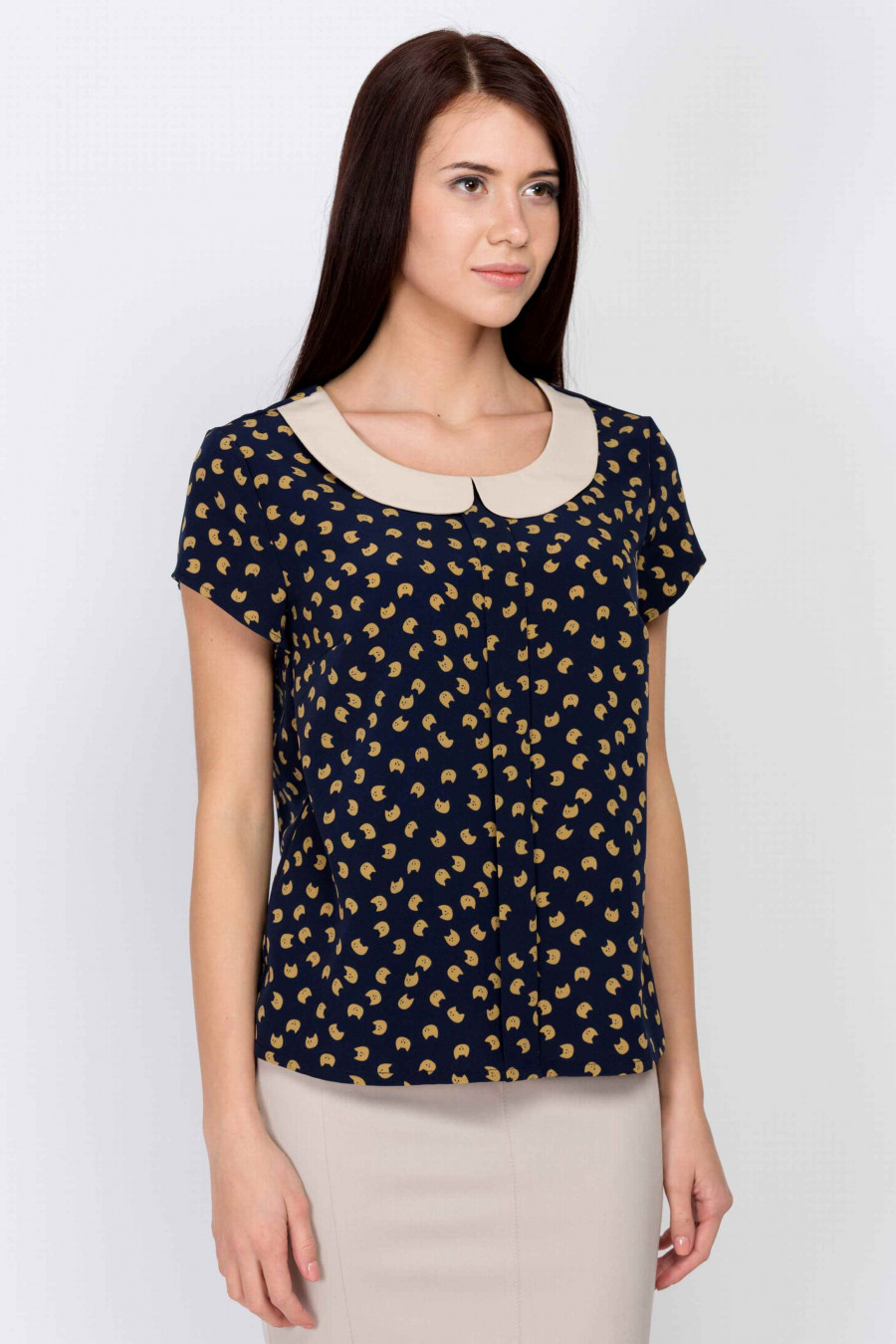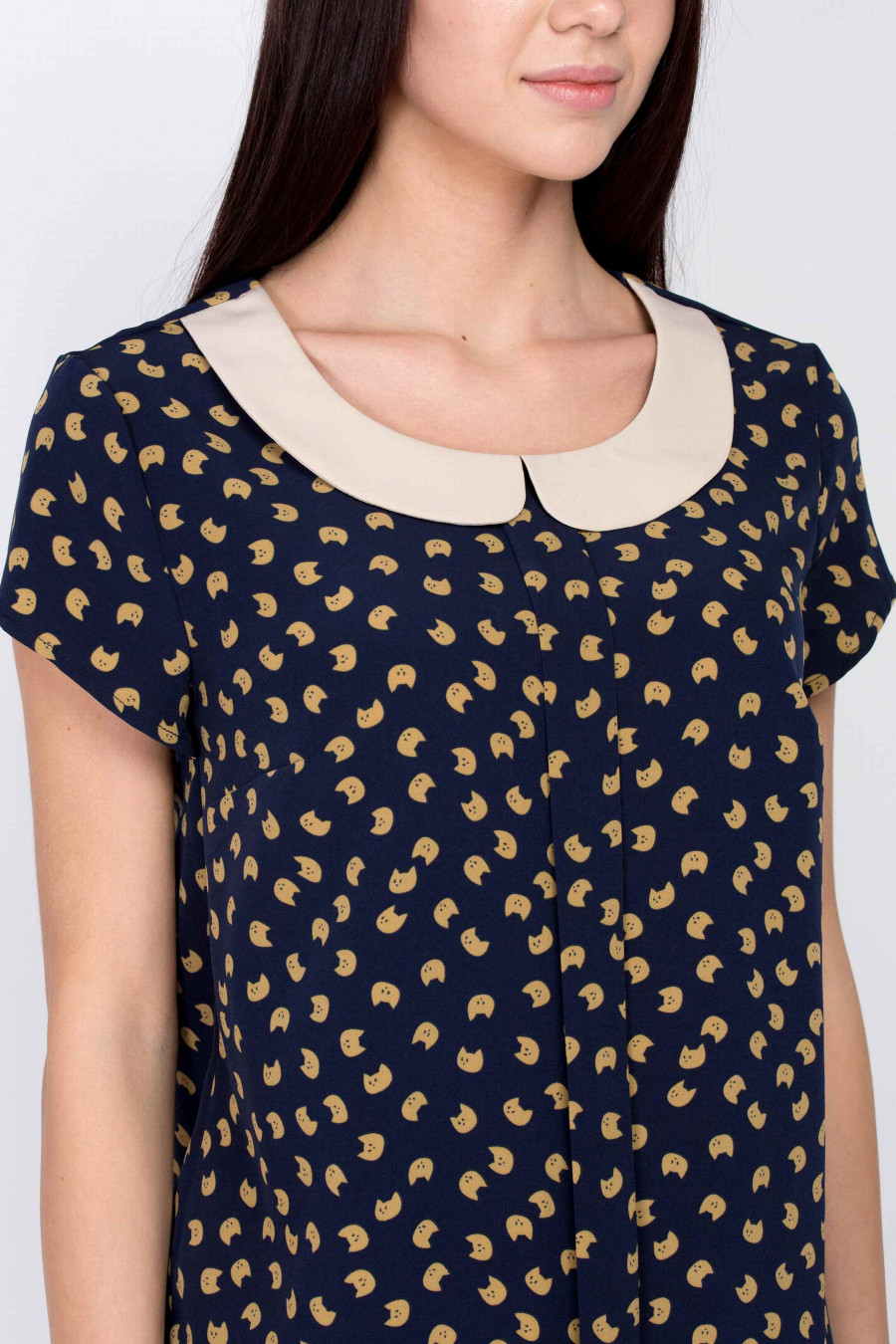Легкая блузка с оригинальным принтом в виде бежевых кошек. Ткань темно-синего цвета мягкая, приятная к телу, немного просвечивает. Стильная изюминка блузки - бежевый закругленный воротник на полочке. Блузка хорошо подойдет для офиса, отлично сочетается с классическими юбками.