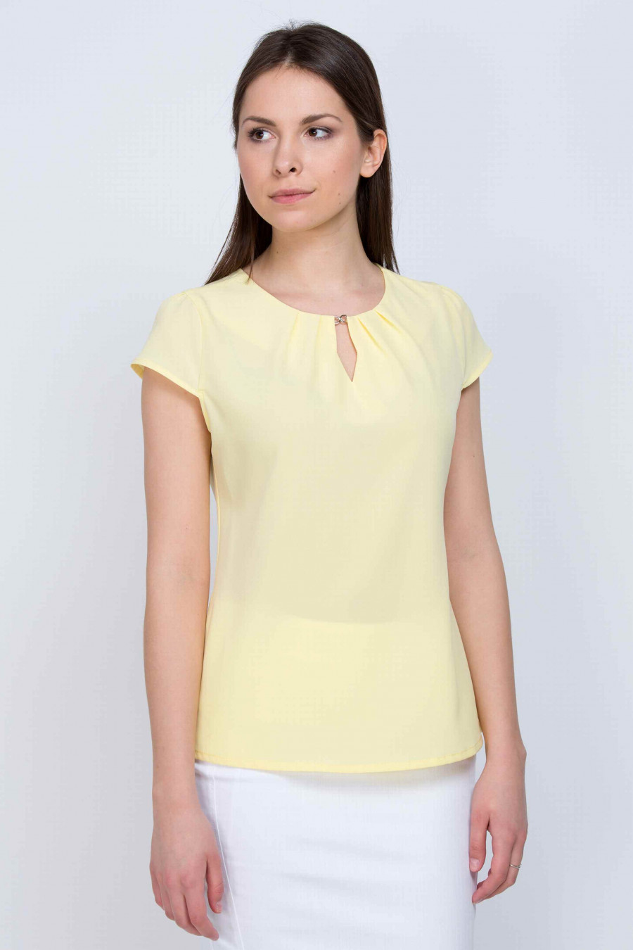 Легкая приталенная блузка желтого цвета. Ткань струящаяся, очень приятная к телу. Горловина с мягкими складками, фигурным вырезом и аккуратным металлическим украшением. Отличный вариант для офиса. Хорошо сочетается со светлыми классическими юбками кроя «карандраш».