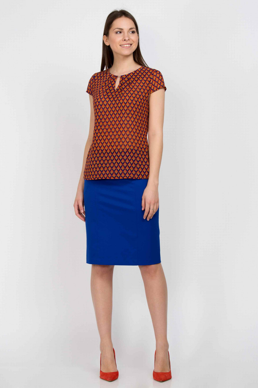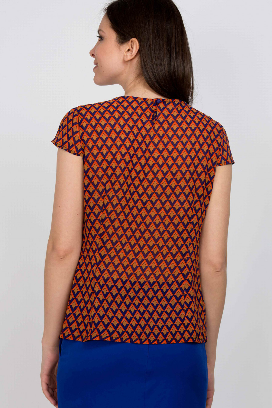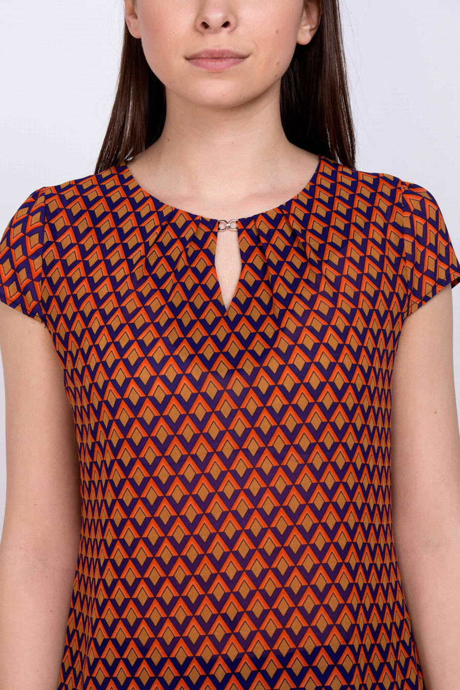 Легкая приталенная блузка коричневого цвета с фиолетовым принтом. Ткань струящаяся, очень приятная к телу. Горловина с мягкими складками, фигурным вырезом и аккуратным металлическим украшением. Отличный вариант для офиса. Хорошо сочетается с однотонными классическими юбками кроя «карандраш».