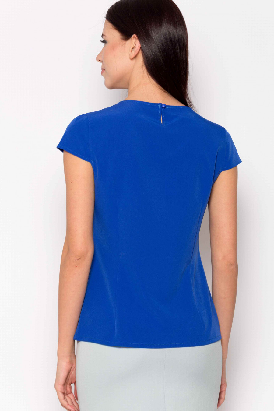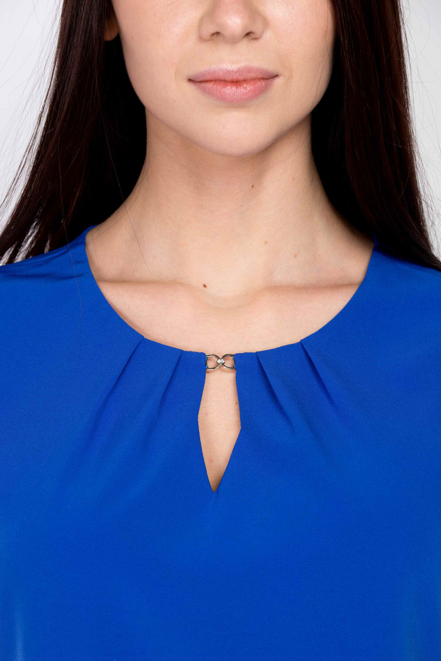 Легкая приталенная блузка цвета электрик. Ткань струящаяся, очень приятная к телу. Горловина с мягкими складками, фигурным вырезом и аккуратным металлическим украшением. Отличный вариант для офиса. Хорошо сочетается с классическими юбками кроя «карандраш».
