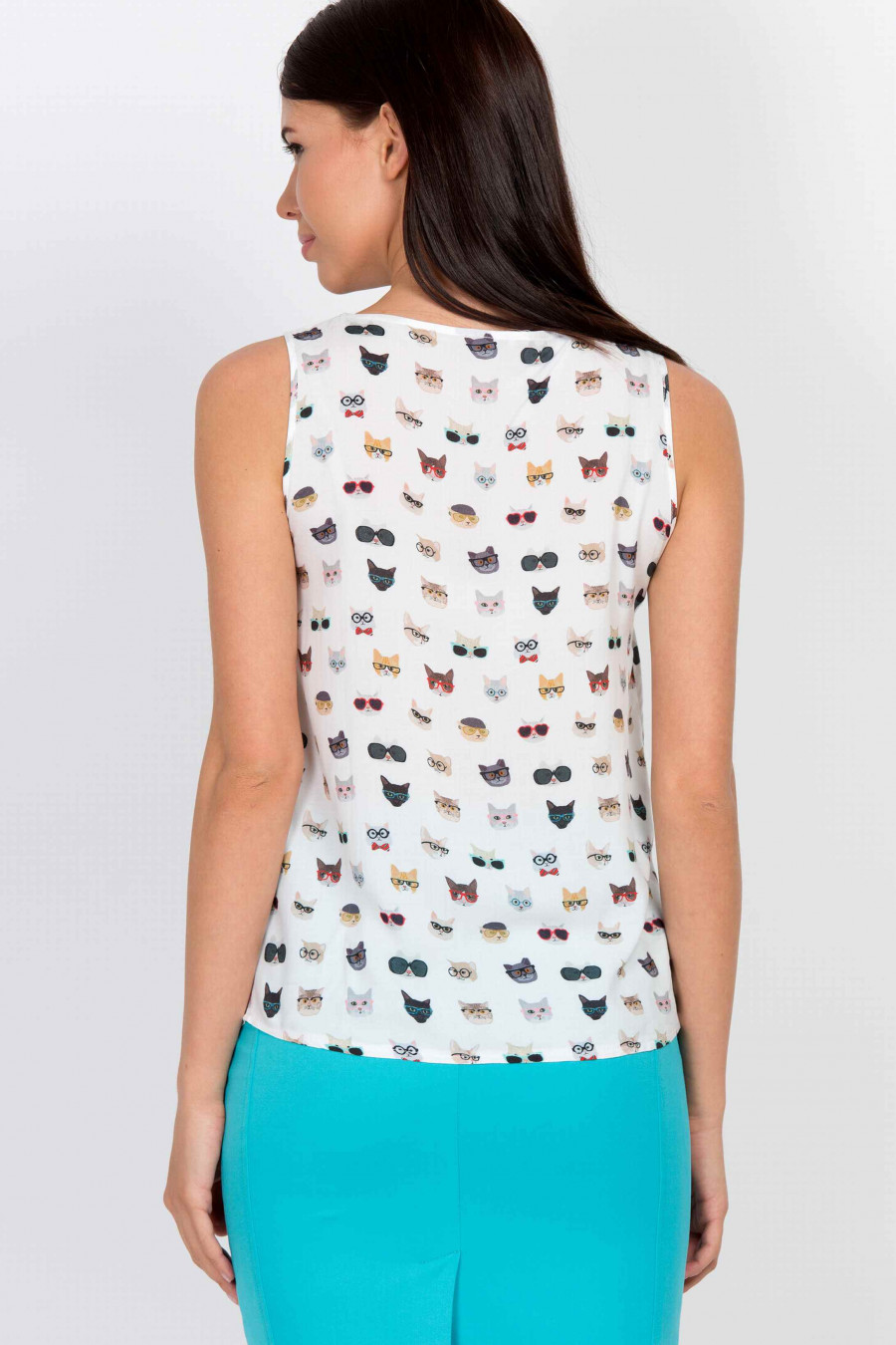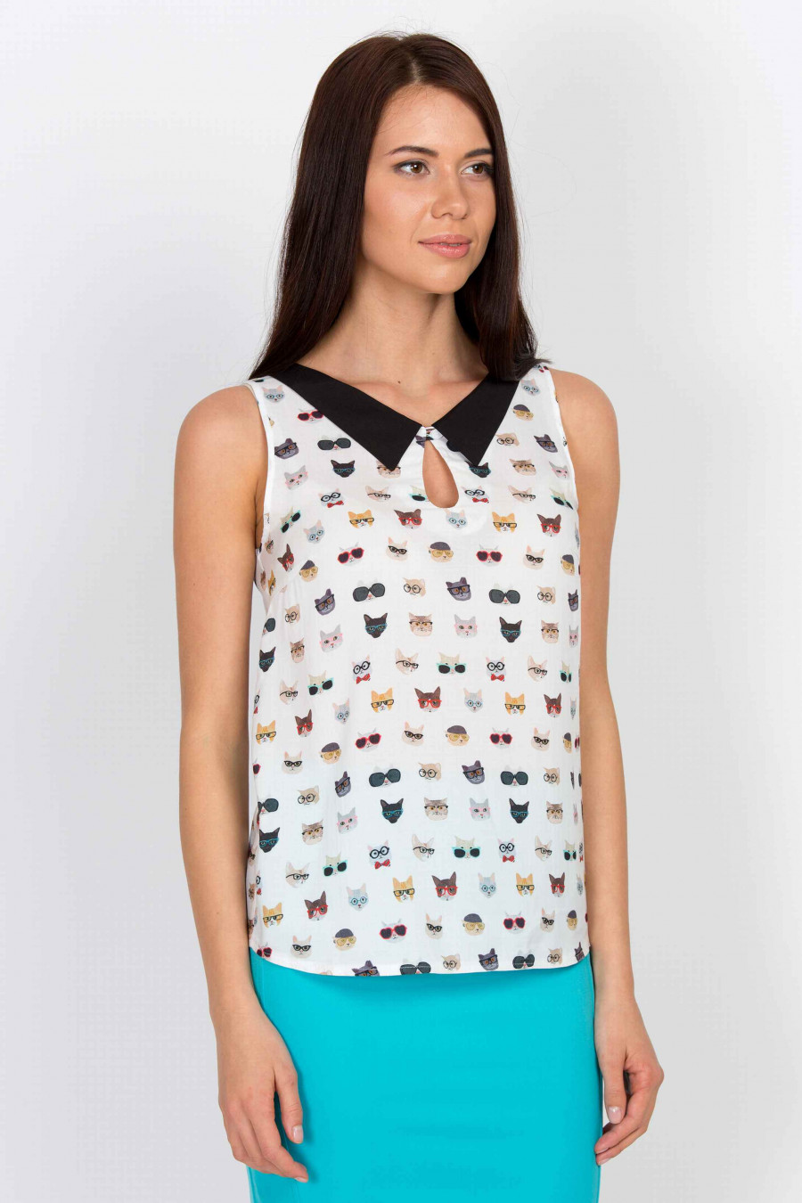 Легкая блузка из натурального хлопка, очень приятная к телу. Цвет белый с оригинальным принтом в виде котиков в очках. Стильная изюминка блузки - черный аккуратный воротничок на полочке с заостренными углами. Блузка без рукавов, горловина спереди оформлена капелькой и застежкой на пуговицу в тон. Благодаря сочетанию интересного принта и черного воротничка блузка выглядит очень стильно и современно. Отлично сочетается, как с классическими юбками и брюками, так и с джинсами. Такую блузку можно смело надевать в офис, а после с ярким аксессуаром блистать на вечеринке.