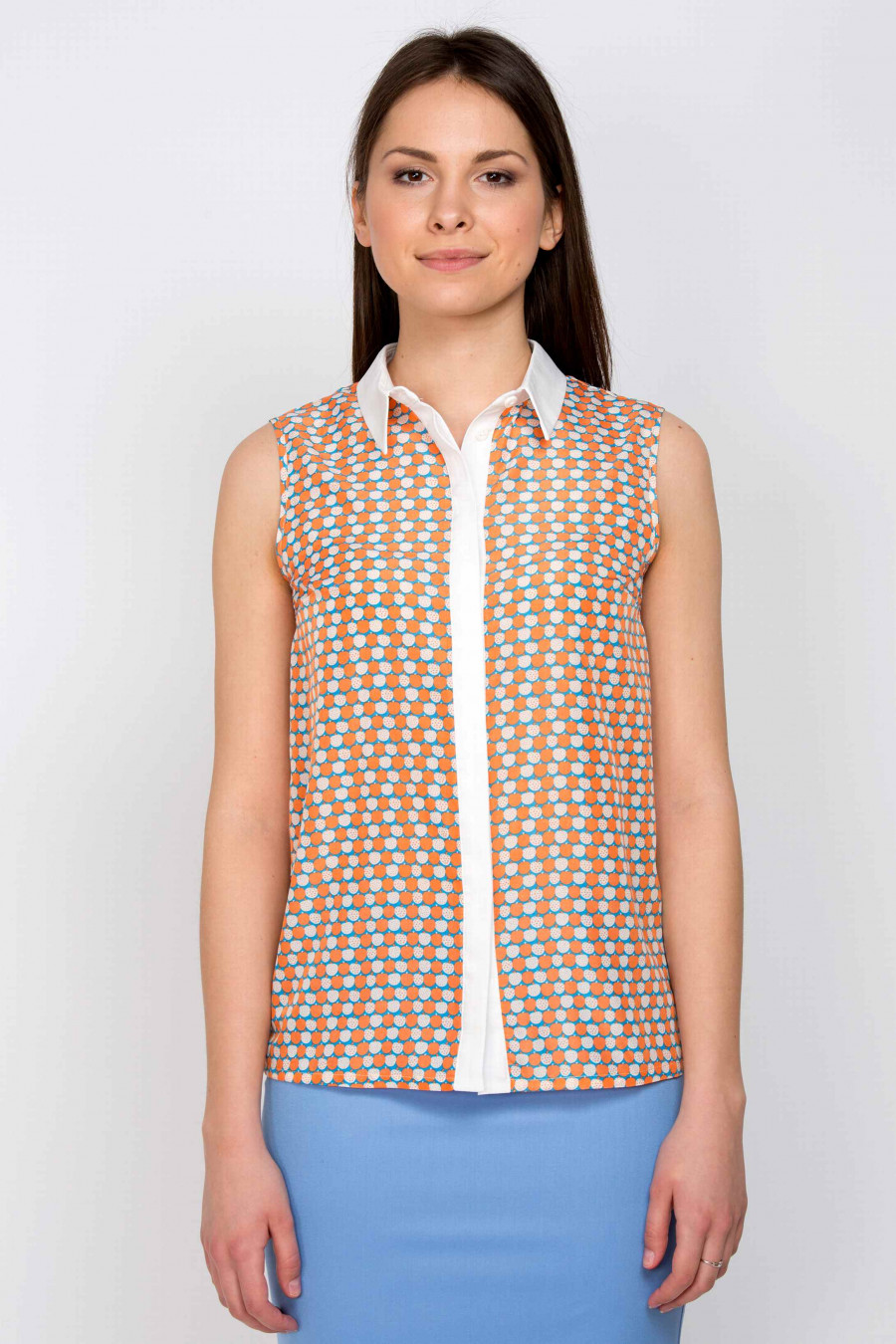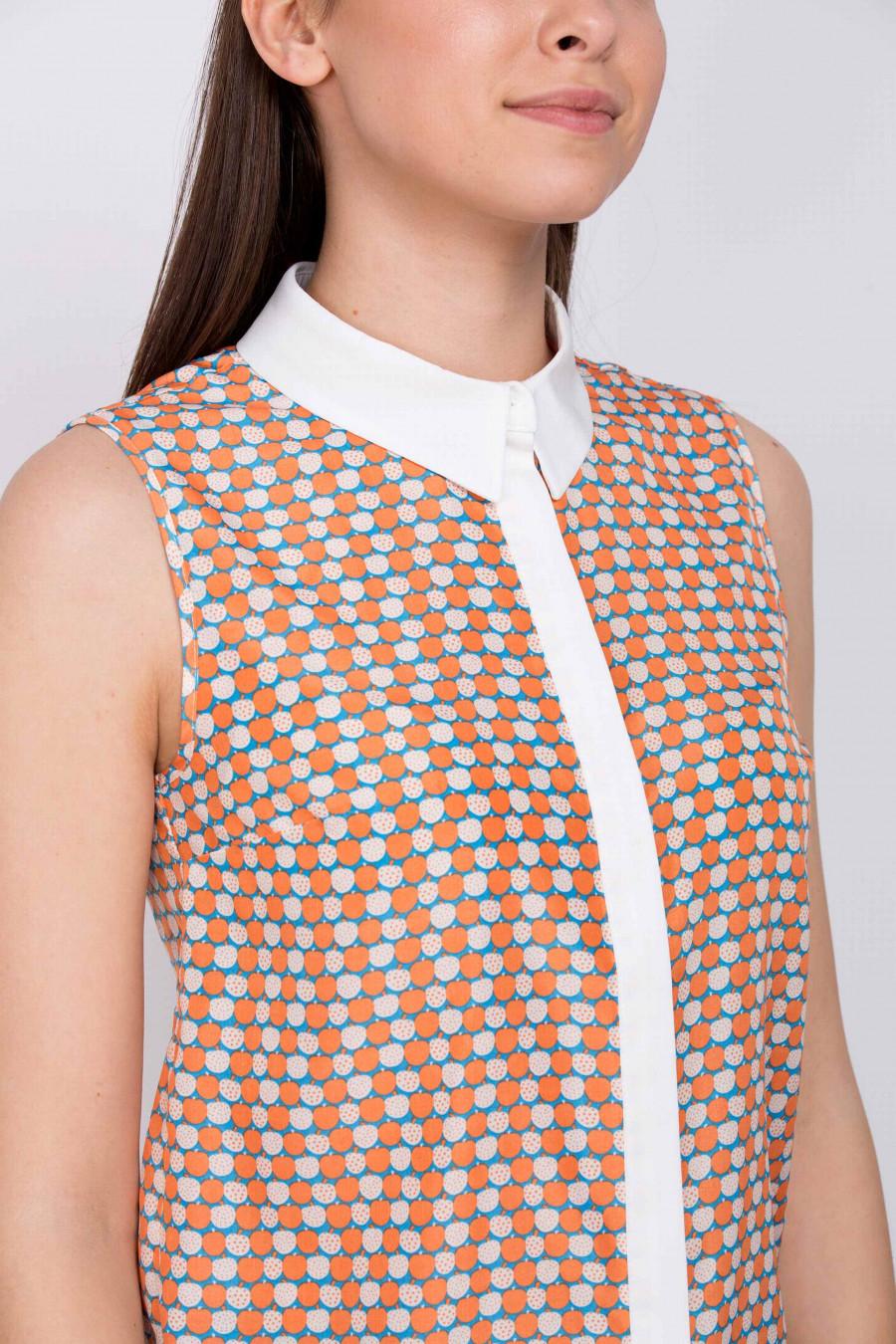 Легкая блузка из мягкой, приятной к телу ткани с оригинальным принтом в виде яблок. Блузку украшает элегантный белый воротничок и планка со скрытыми пуговицами. Отличная модель для офиса, хорошо сочетается с однотонными юбками классического кроя.