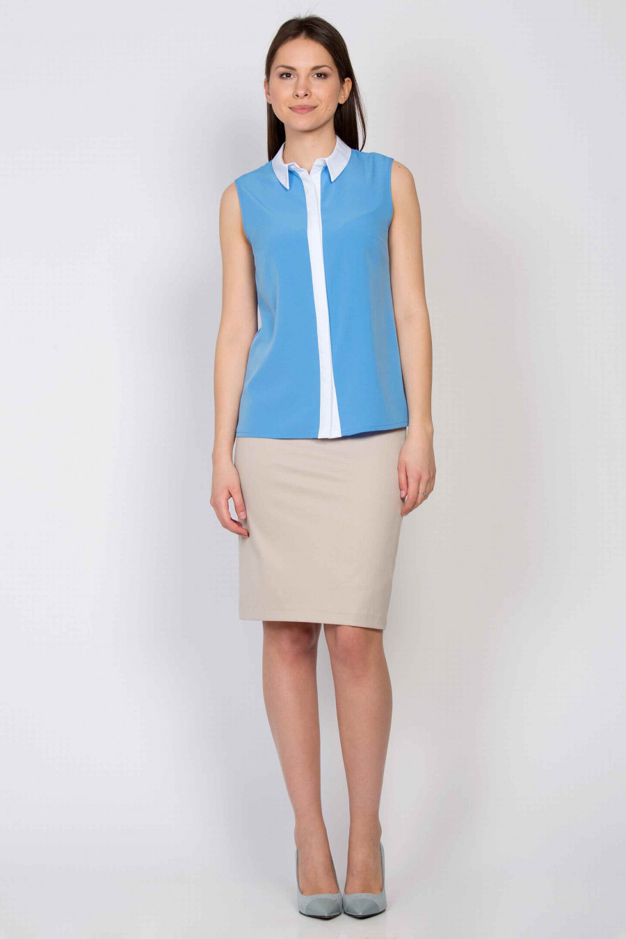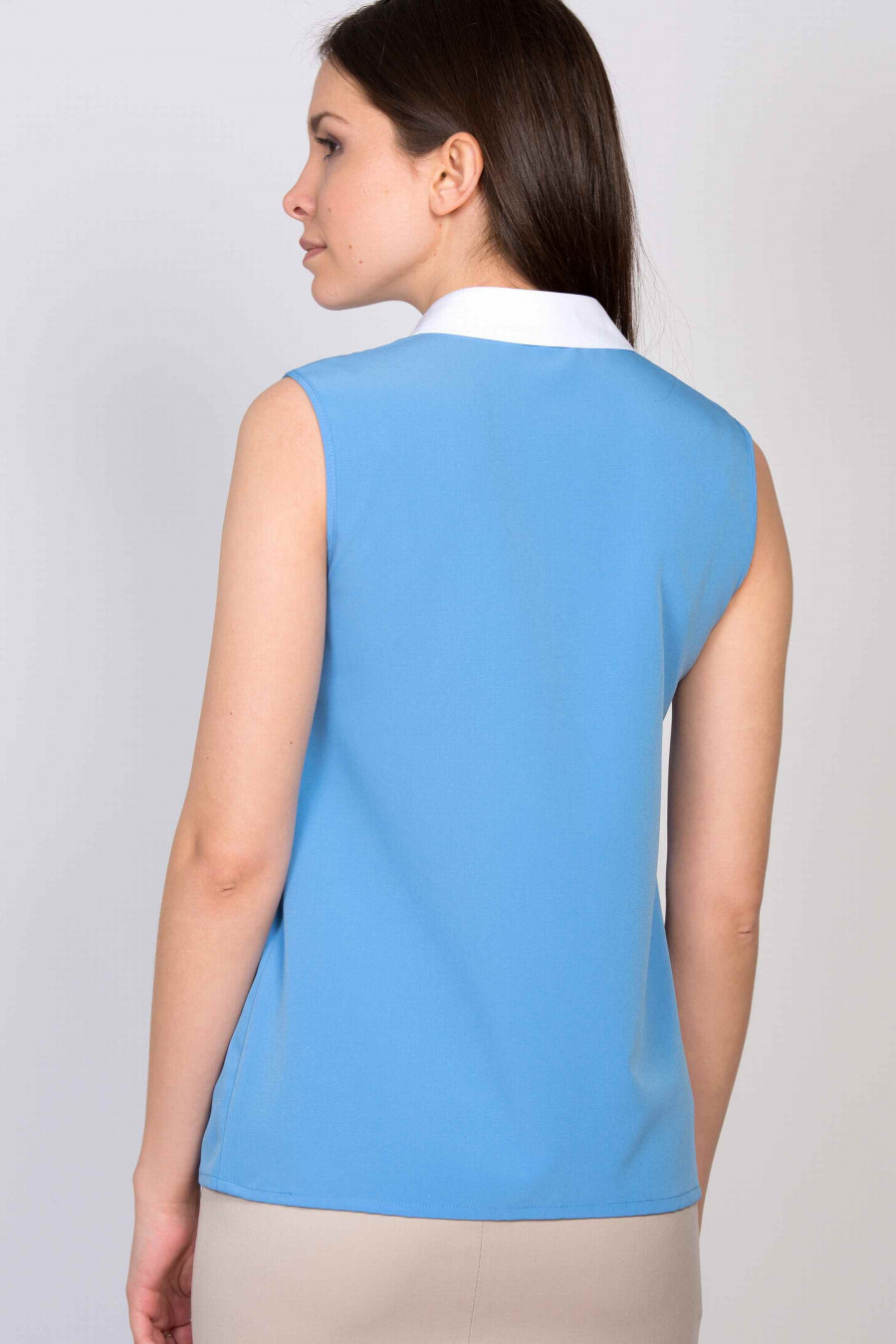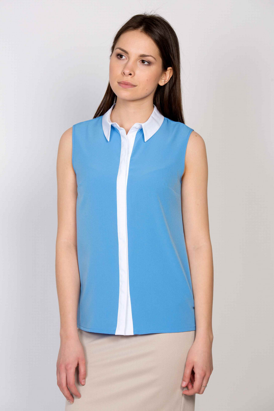 Легкая блузка из мягкой, приятной к телу ткани пастельно-голубого цвета. Блузку украшает элегантный белый воротничок и планка со скрытыми пуговицами. Отличная модель для офиса, хорошо сочетается со светлыми юбками классического кроя.