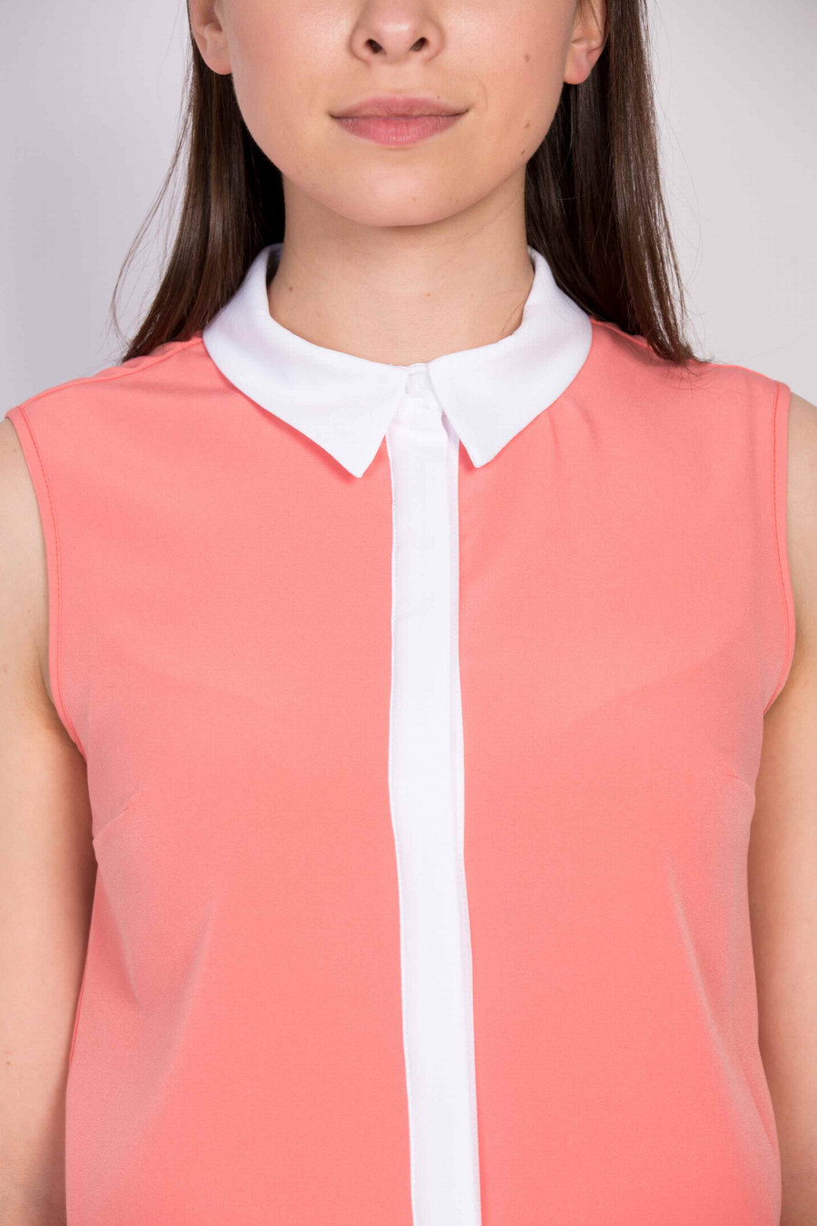 Легкая блузка из мягкой, приятной к телу ткани розового цвета. Блузку украшает элегантный белый воротничок и планка со скрытыми пуговицами. Отличная модель для офиса, хорошо сочетается с однотонными юбками классического кроя.