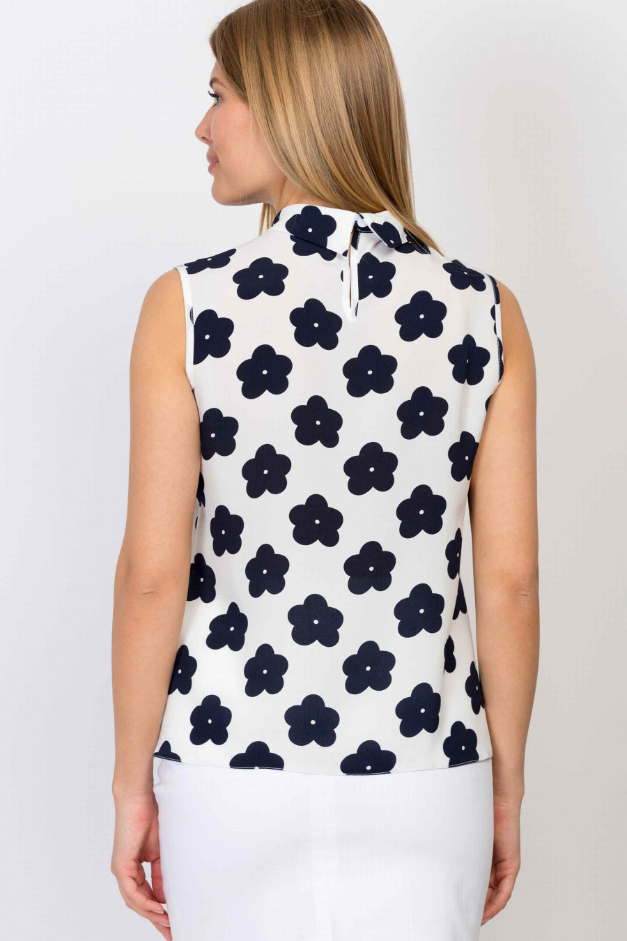 Легкая блузка с воротником-стойкой. Ткань светлая с ярким цветочным принтом темно-синего цвета. На горловине мягкие складки, сзади застегивается на пуговицу. Очень комфортная модель, неприхотливая в носке, не мнется. Хорошо подойдет для офиса, сочетается с однотонными юбками классического кроя.