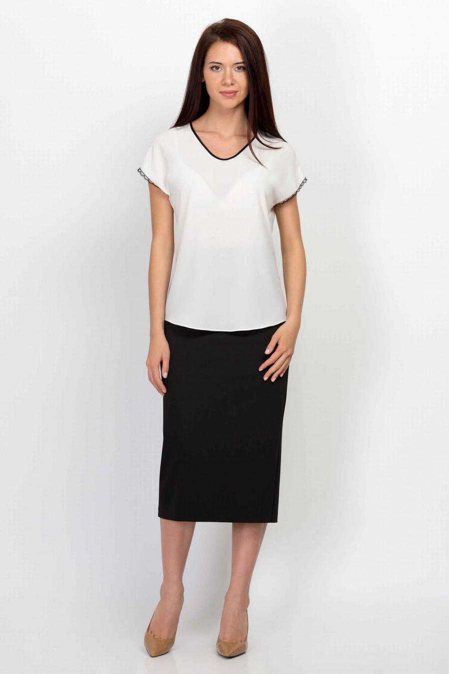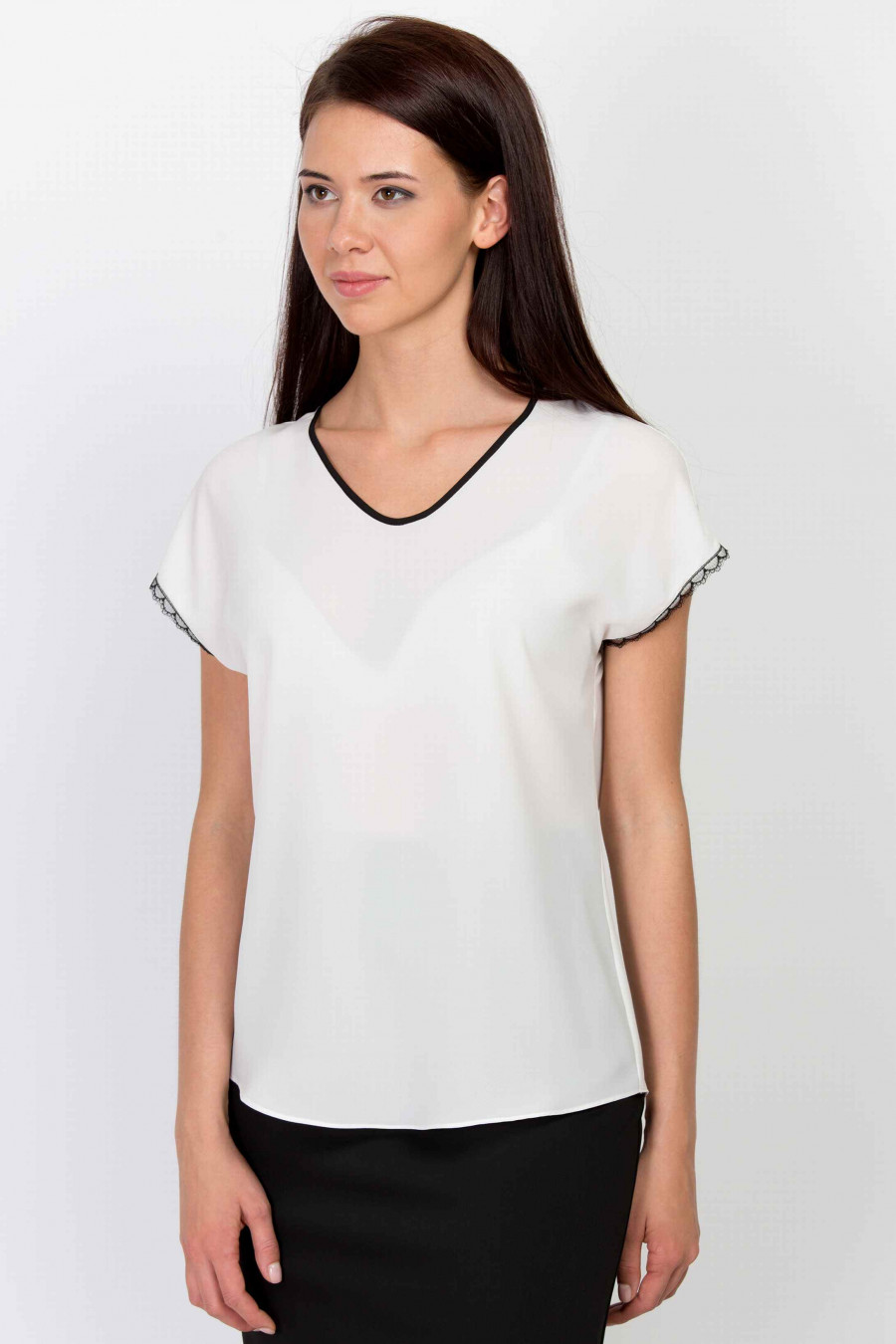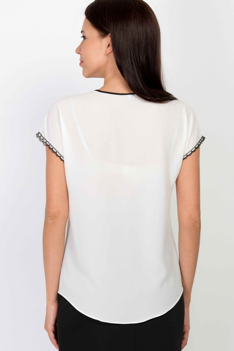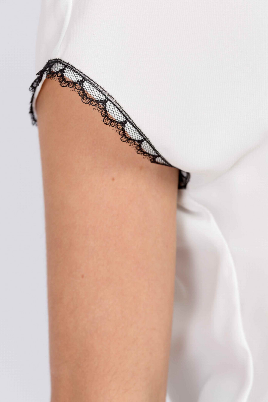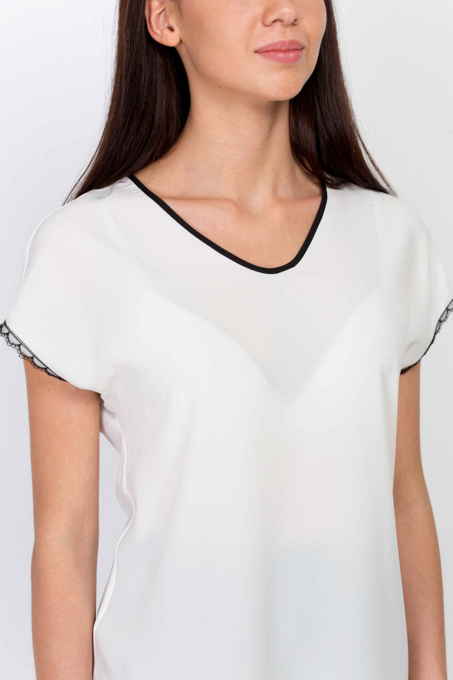 Легкая блузка свободного кроя с черной кружевной отделкой на рукавах. Ткань фактурная, приятная к телу белого цвета. Блузка поможет создать привлекательный женственный образ. Хорошо сочетается с классическими юбками, подойдет на повседневную носку.