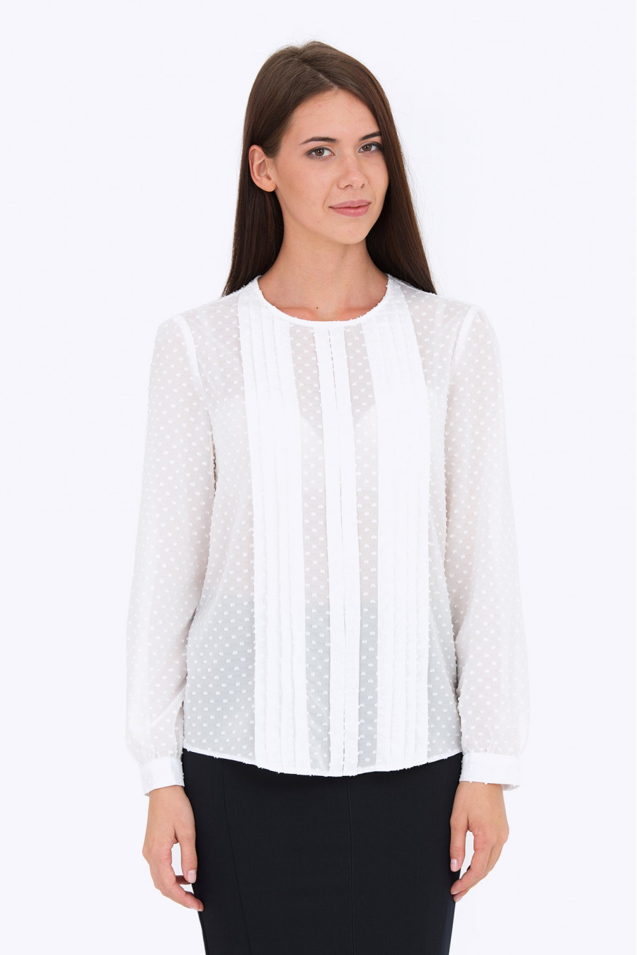 Легкая белая блузка с длинными рукавами. Ткань с объемным мелким принтом, слегка просвечивает. Спереди блузка оформлена аккуратными складками. Крой блузки свободный, хорошо подходит для любого типа фигур. Отличная модель на повседневную носку. Образ на фотографии дополняет юбка 544-doroti.