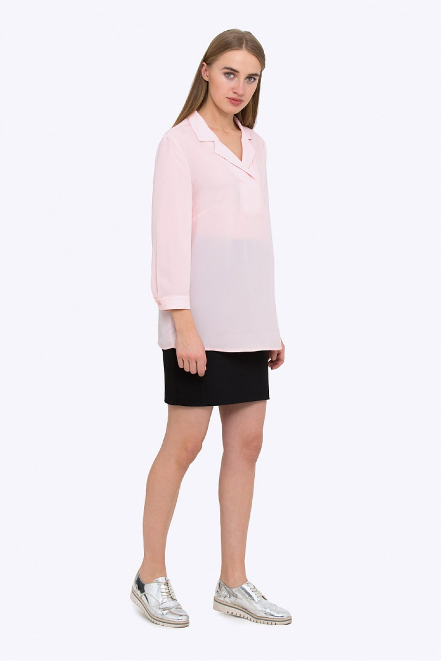 Легкая блузка с оригинальным фигурным воротником с запахом. Ткань струящаяся приятная к телу. Блузка свободного кроя, подойдет для любого типа фигуры. Хорошо сочетается как с классическими вещами, так и с джинсами. Отличная модель на повседневную носку. Рост фотомодели 172 см.