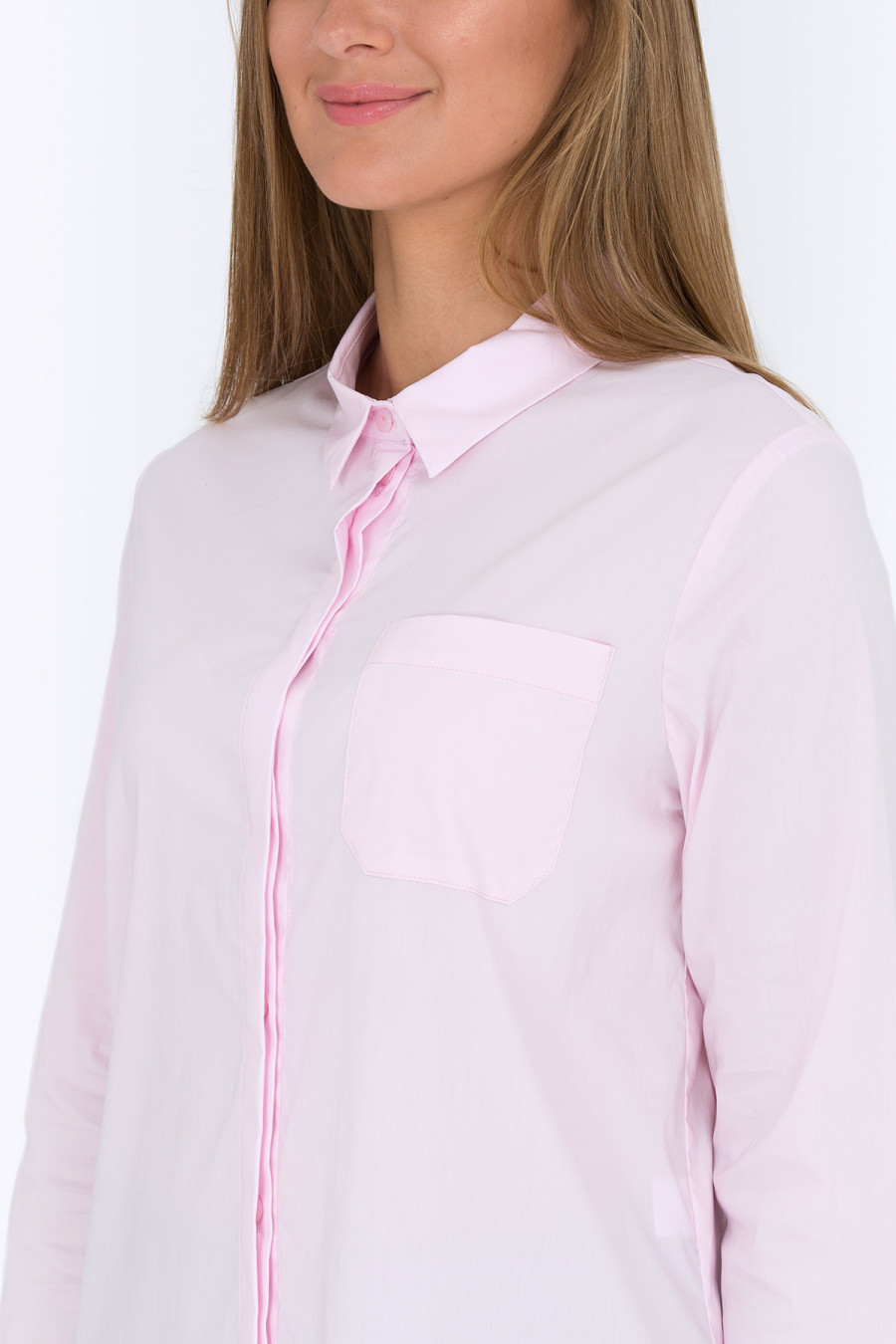 Замечательная хлопковая рубашка нежно-розового цвета. Застегивается на планку с пуговицами. Очень стильная и комфортная модель, идеально сочетается с однотонными юбками или брюками. Благодаря свободному крою и асимметричному низу рубашка хорошо сидит по фигуре, не сковывает движения. Рост фотомодели 172 см.