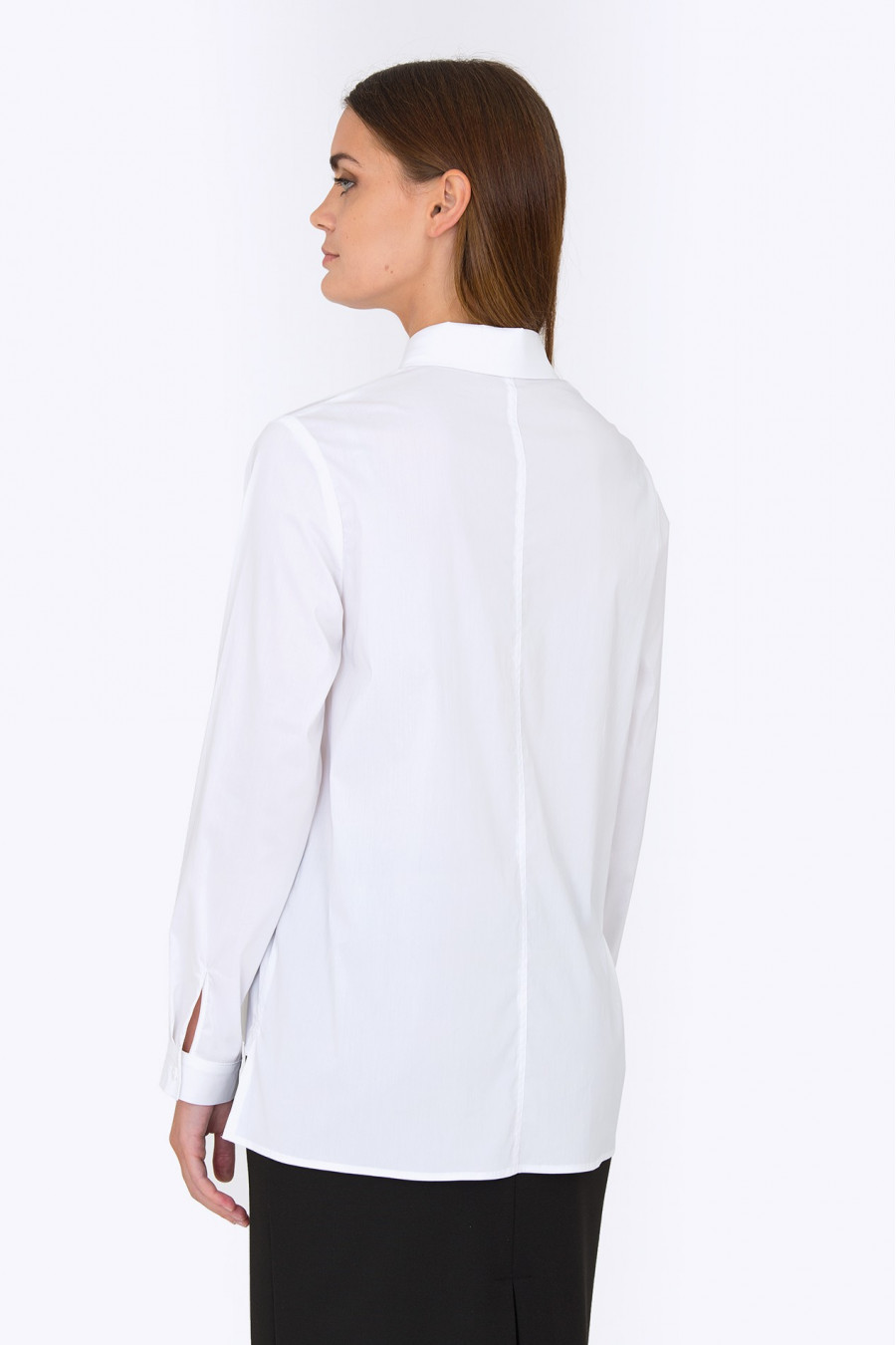 Замечательная хлопковая рубашка белого цвета. Застегивается на планку с пуговицами. Очень стильная и комфортная модель, идеально сочетается с однотонными юбками или брюками. Благодаря свободному крою и асимметричному низу рубашка хорошо сидит по фигуре, не сковывает движения.
