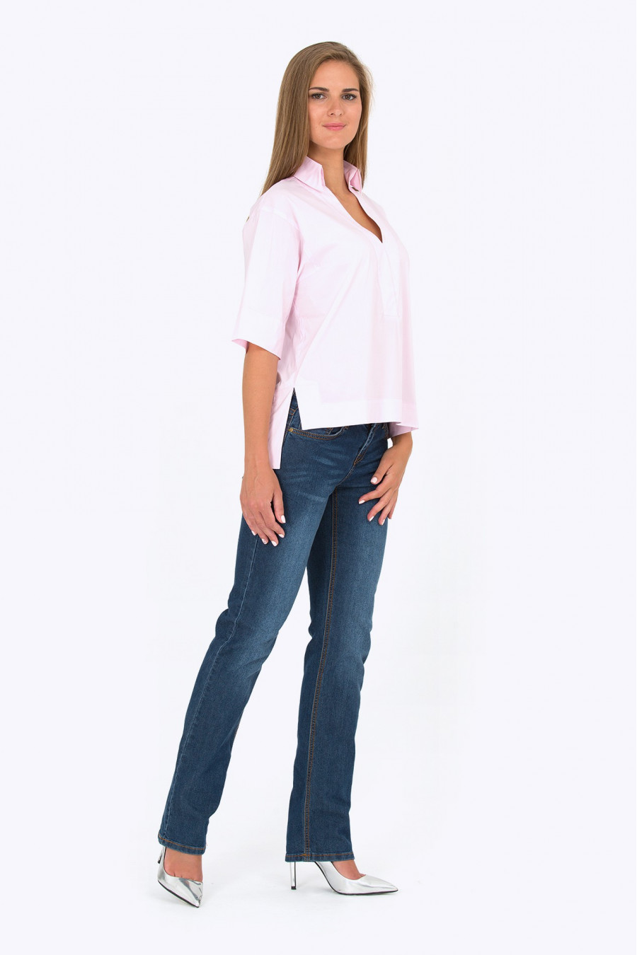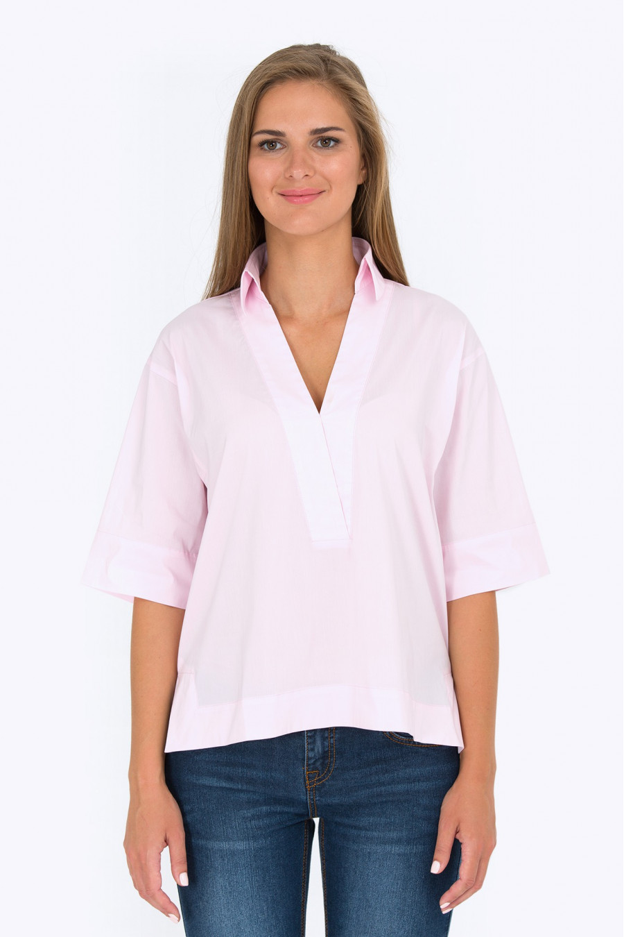 Нежно-розовая рубашка из хлопка с добавлением лайкры. Очень стильная и интересная модель для офиса. Глубокий V-образный вырез переходит в аккуратный воротник-стойку. Благодаря свободному крою и асимметричному низу рубашка хорошо сидит по фигуре, не сковывает движения. Рост фотомодели 172 см.
