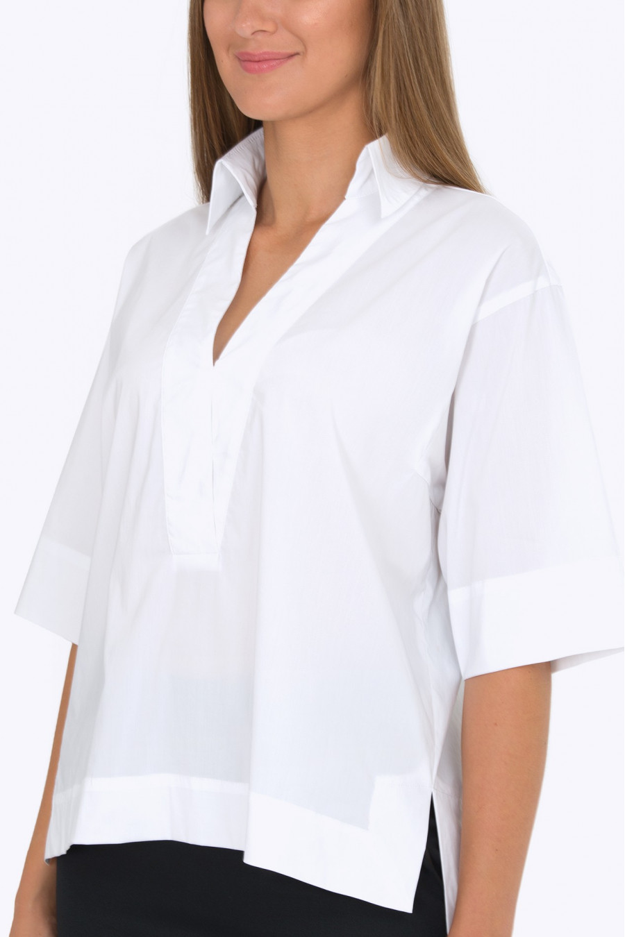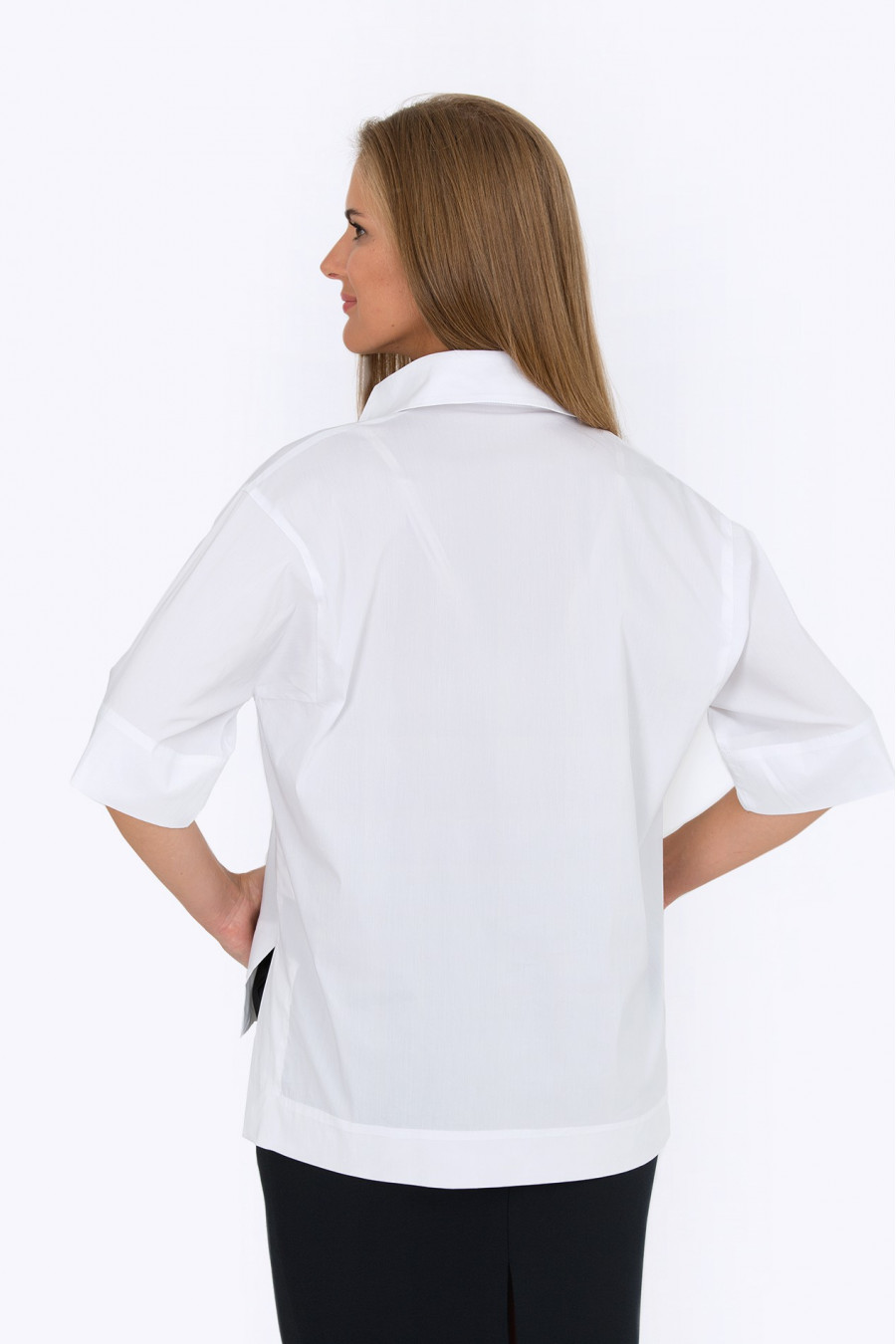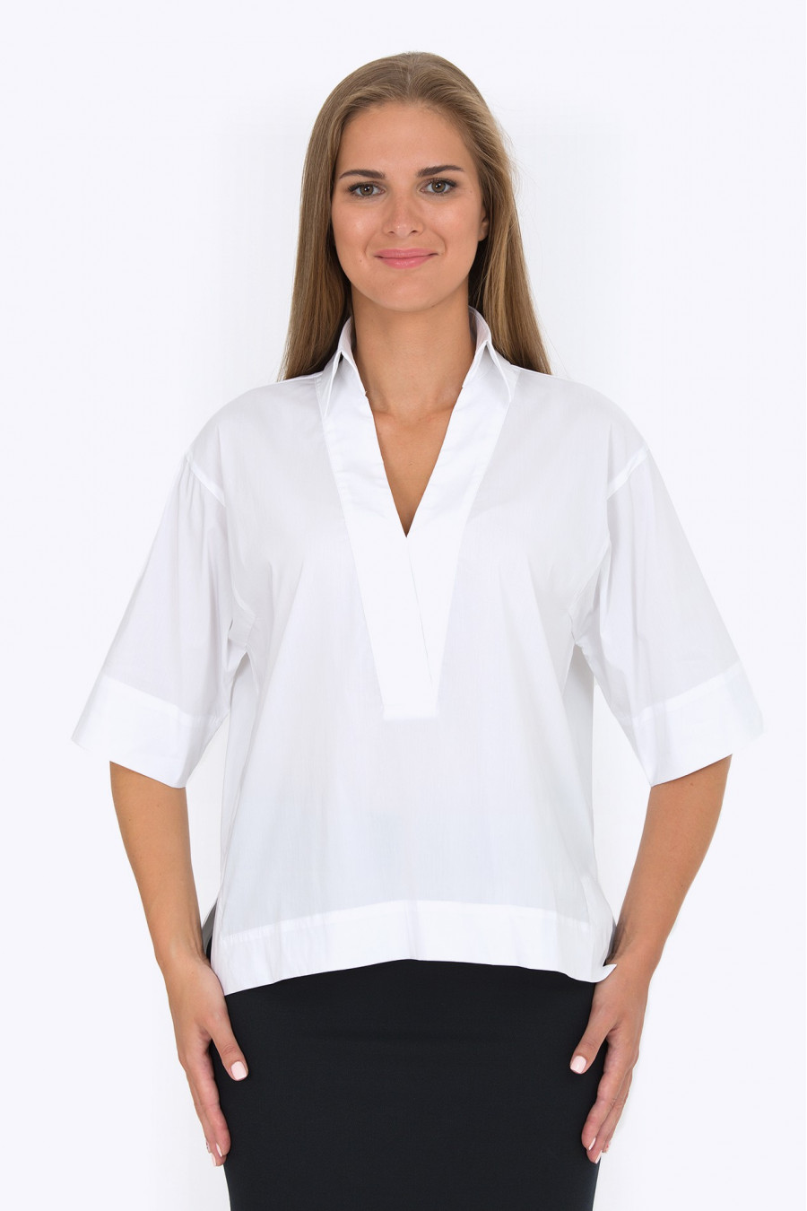 Белоснежная рубашка из хлопка с добавлением лайкры. Очень стильная и интересная модель для офиса. Глубокий V-образный вырез переходит в аккуратный воротник-стойку. Благодаря свободному крою и асимметричному низу рубашка хорошо сидит по фигуре, не сковывает движения. Образ на фотографии дополняет юбка 202-50-dorofeya.