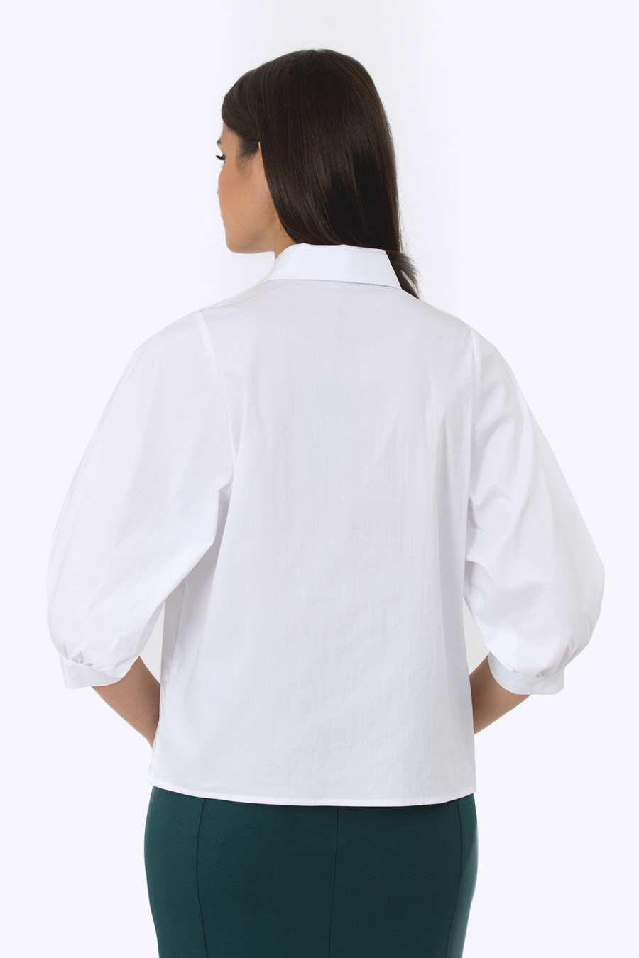 Оригинальная белая блузка с запахом на основе хлопка. Ткань очень приятная к телу с эффектом эластичности. Планка с пуговицами скрыта под запахом. Дизайнерская особенность блузки - рукава-фонарики 3/4 на манжетах и классический воротничок. Отличная модель для офиса, выглядит очень стильно и современно. Рост фотомодели 172 см.